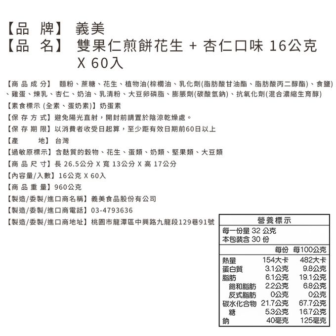 品名:義美 雙果仁煎餅(16gx60包)