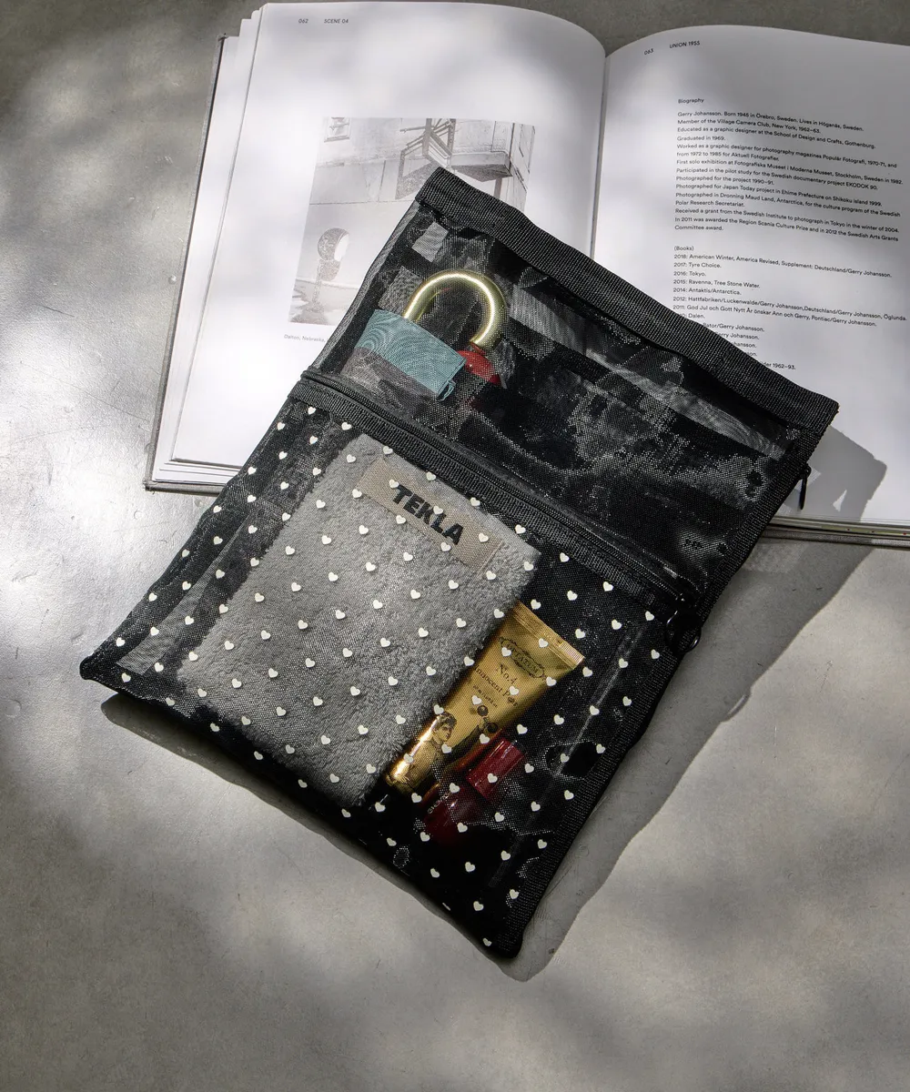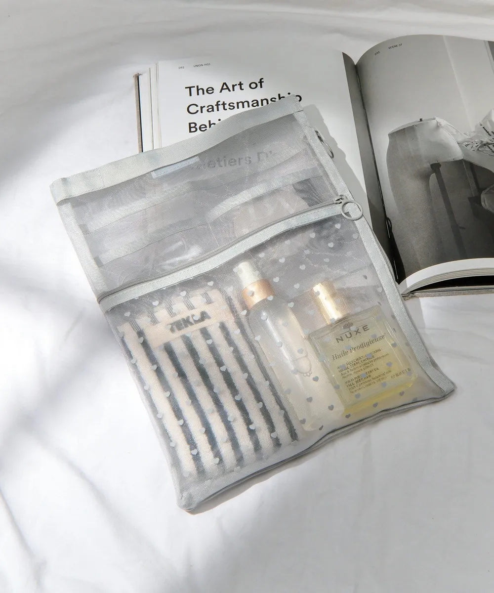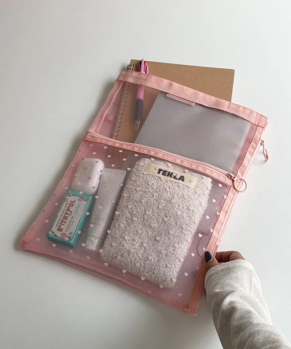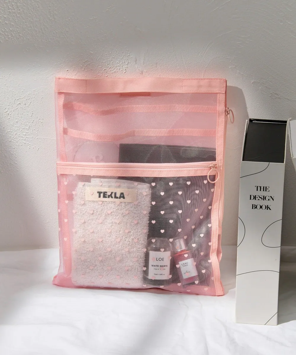 日本 3COINS - 愛心圖案輕巧網狀包中袋-粉紅 (34x26cm)