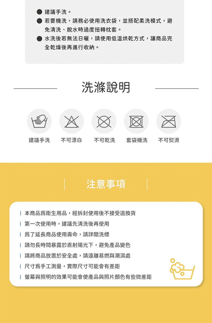 -水洗後若無法日曬,請使用低溫烘乾方式,讓商品完全乾燥後再進行收納。