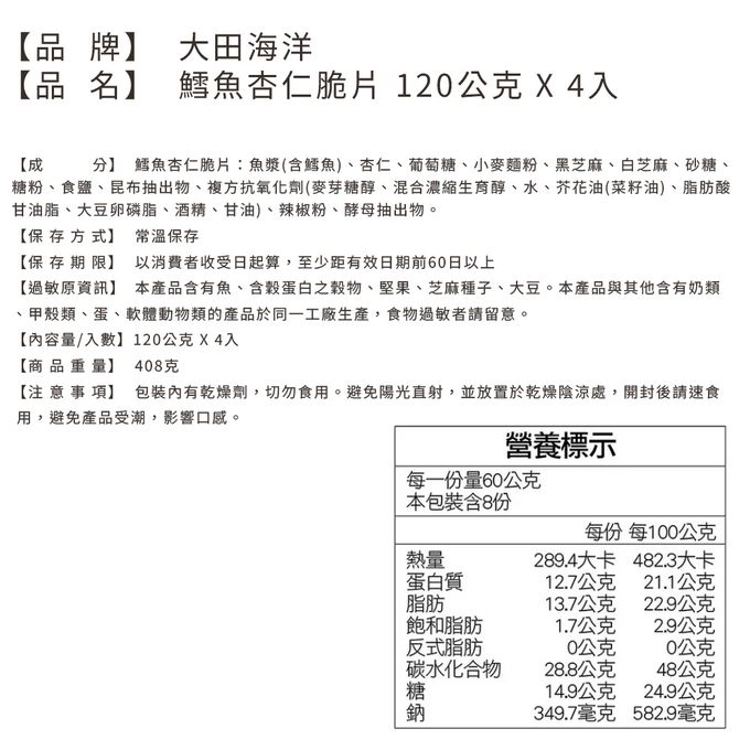 品名:大田海洋 鱈魚杏仁脆片(120公克 X 4入/盒)