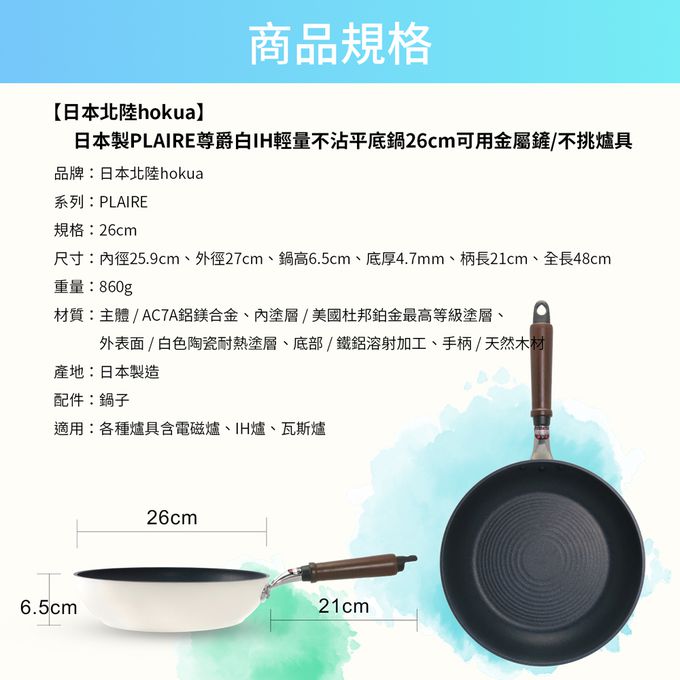 品名:日本製PLAIRE尊爵白IH輕量不沾平底鍋26cm可用金屬鏟/不挑爐具