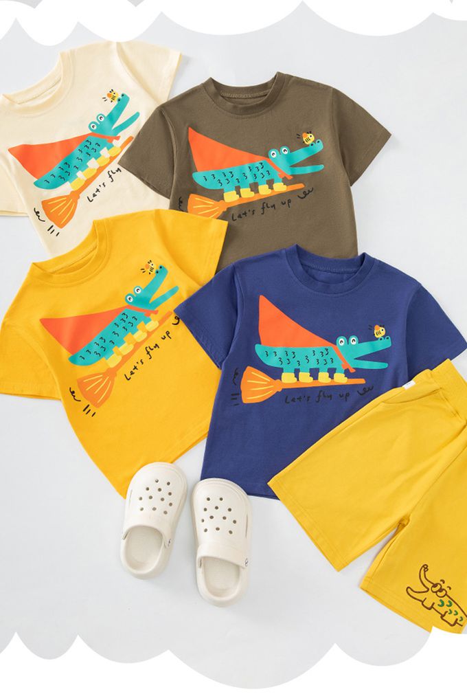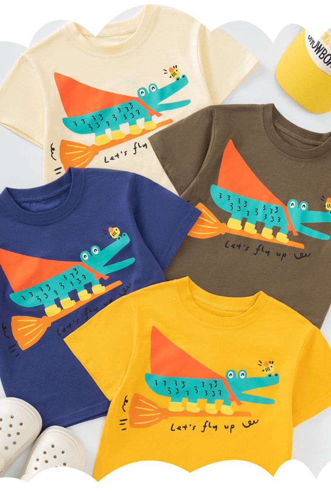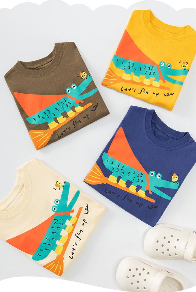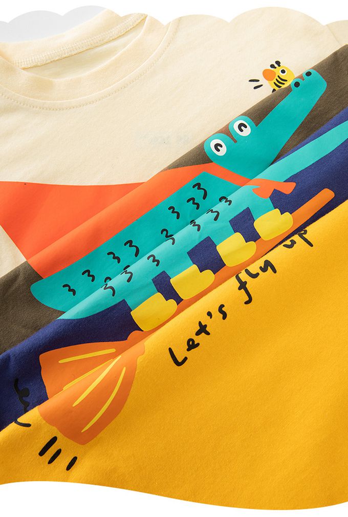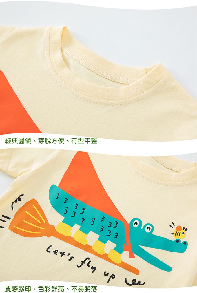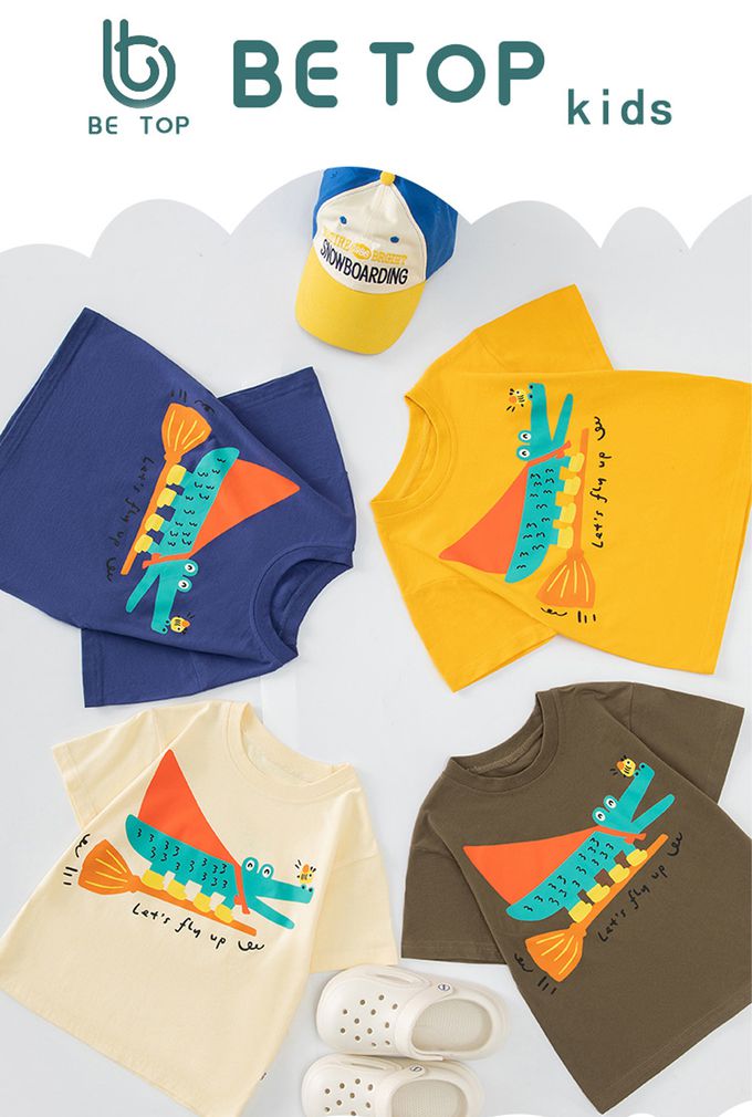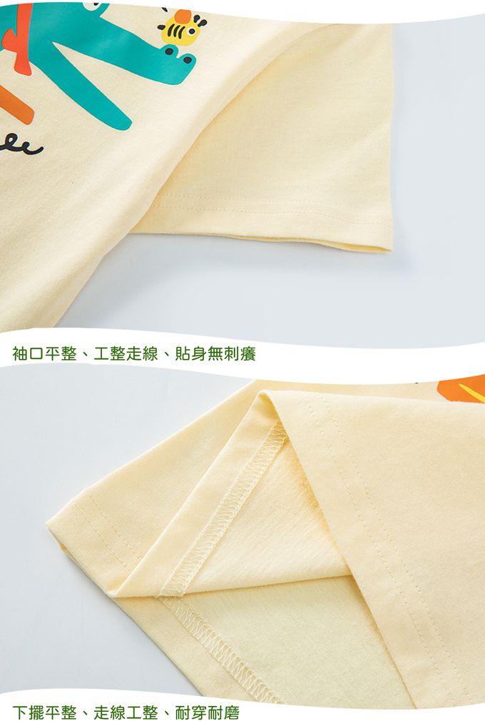 BE TOP - 純棉短袖上衣-可愛恐龍-黃藍拼袖