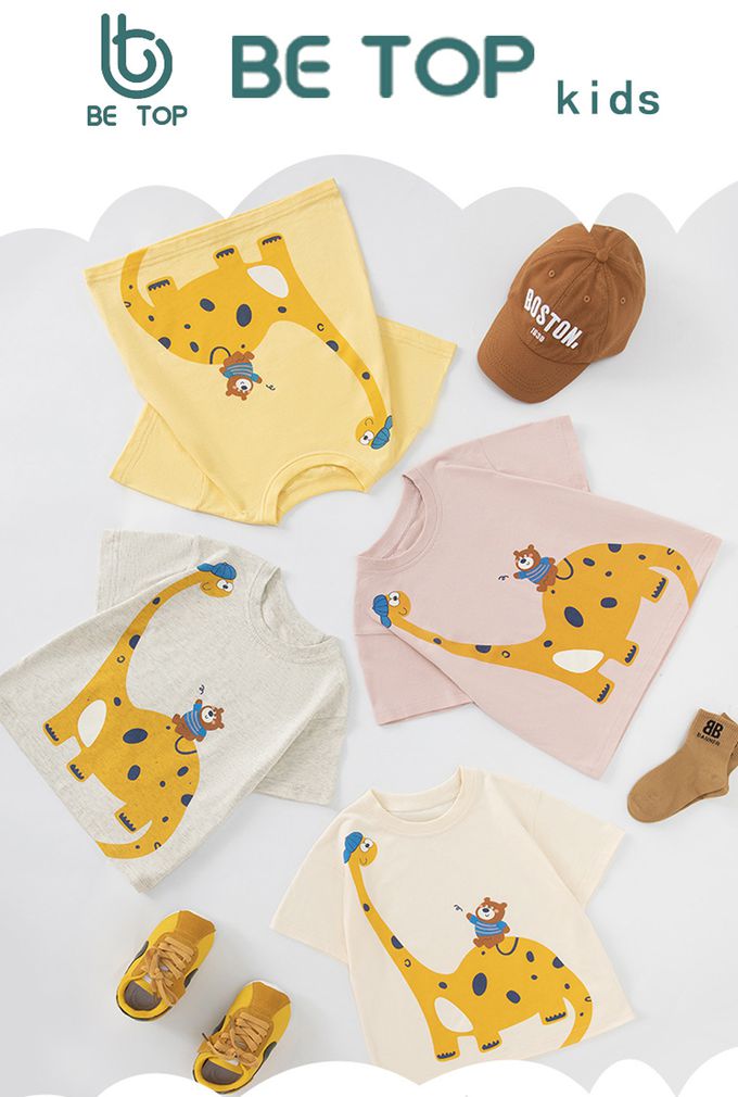 BE TOP - 純棉短袖上衣-可愛恐龍-黃藍拼袖