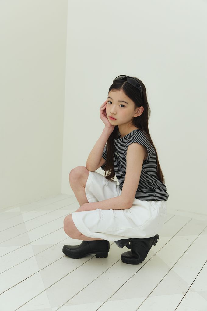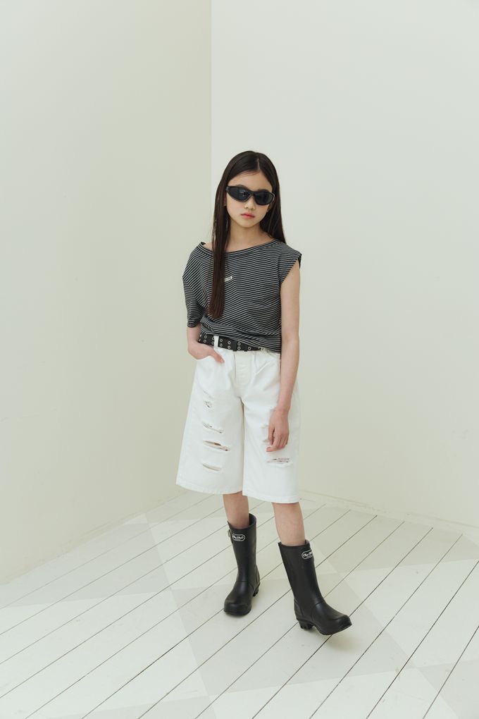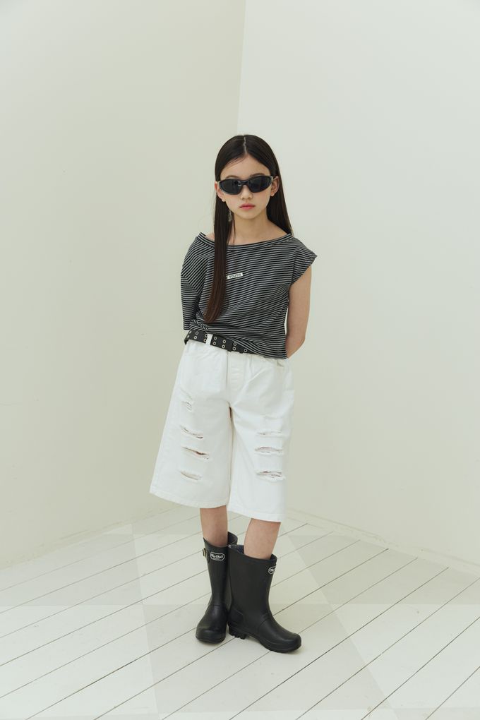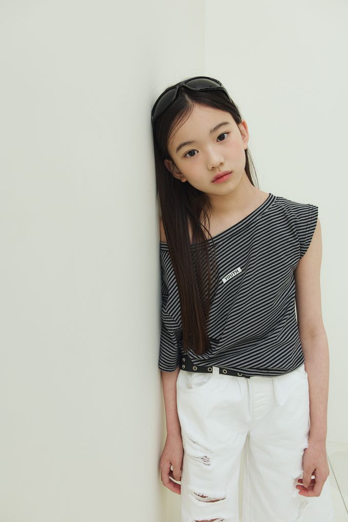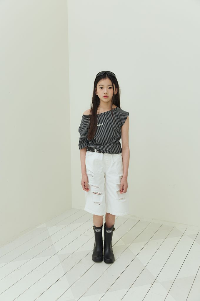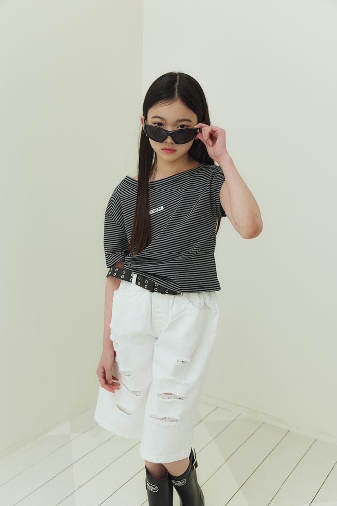 韓國南大門童裝 - sm2 經典條紋造型斜肩短袖上衣-黑