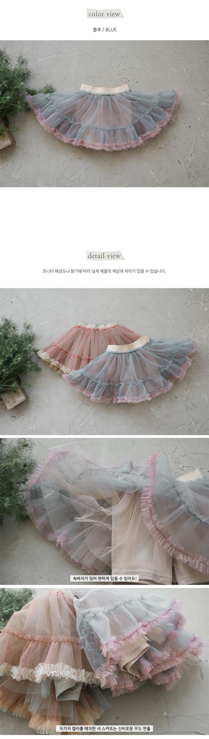 韓國南大門童裝 - Puellaflo 鬆緊腰浪漫拼色內搭褲網紗蓬裙-藍X粉X杏