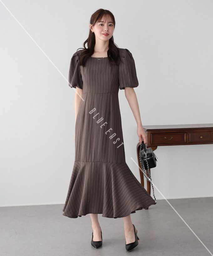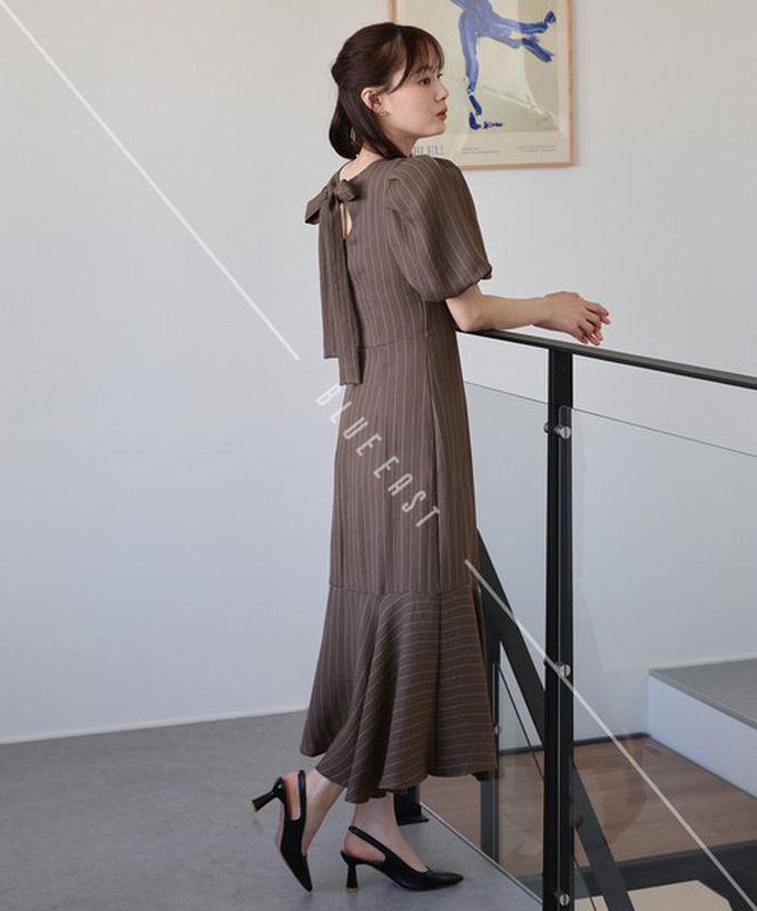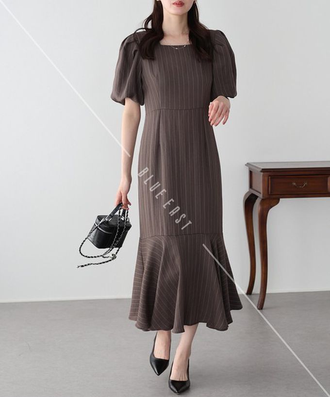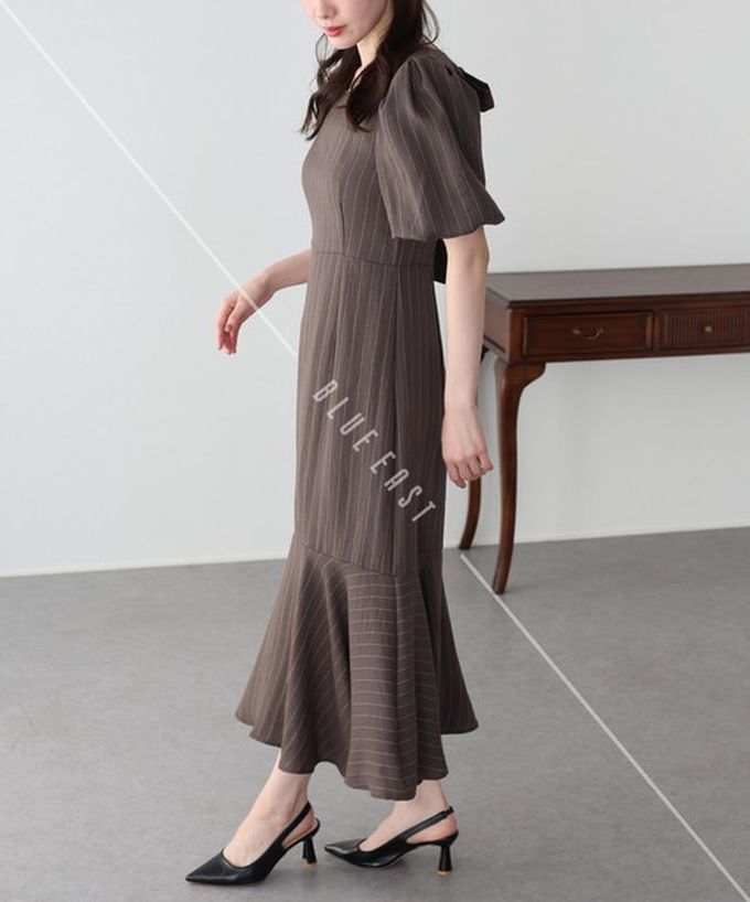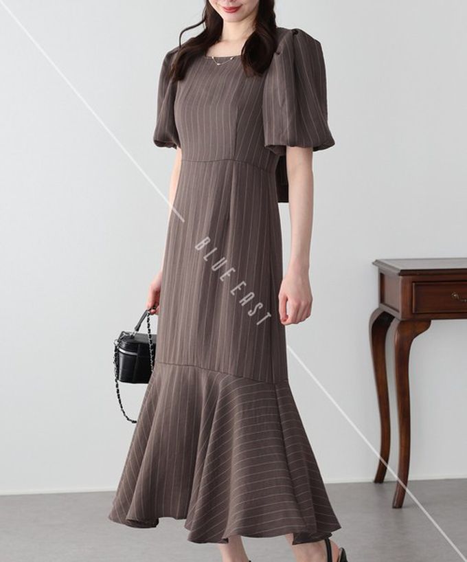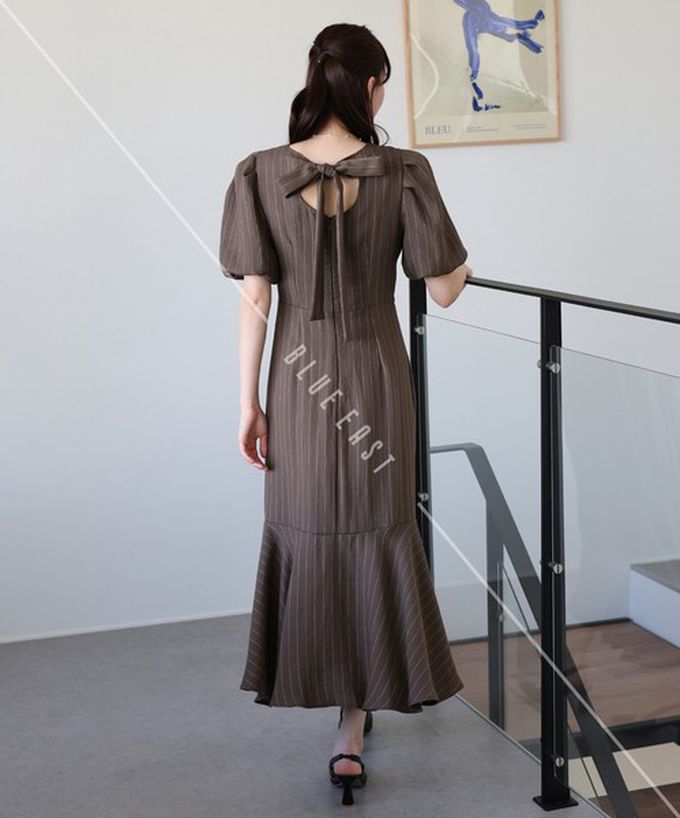 日本 BLUE EAST - 優雅方領後綁帶泡泡袖魚尾洋裝-條紋-咖啡 (M)