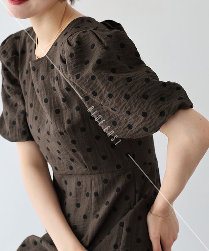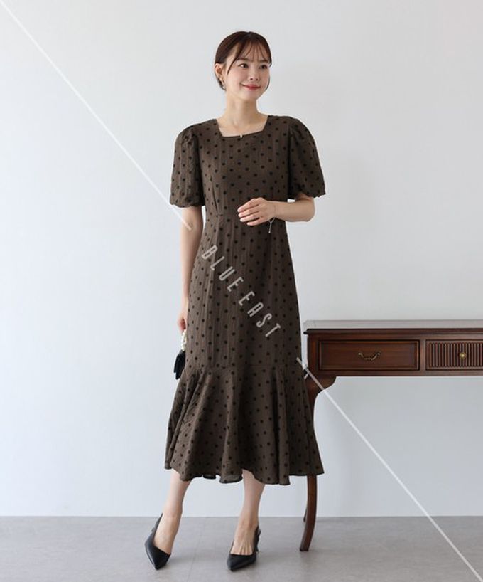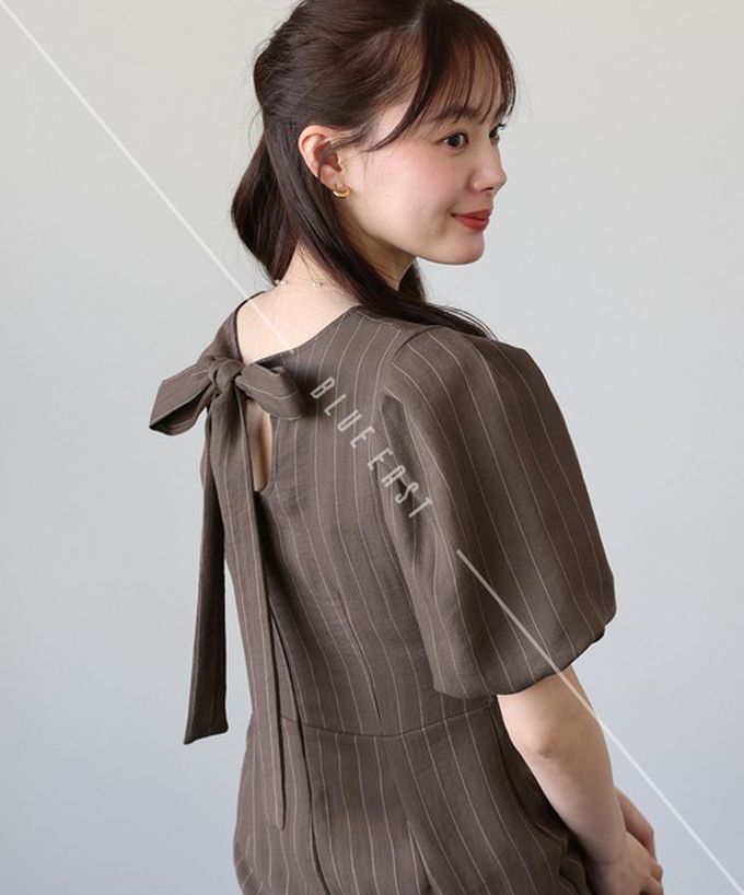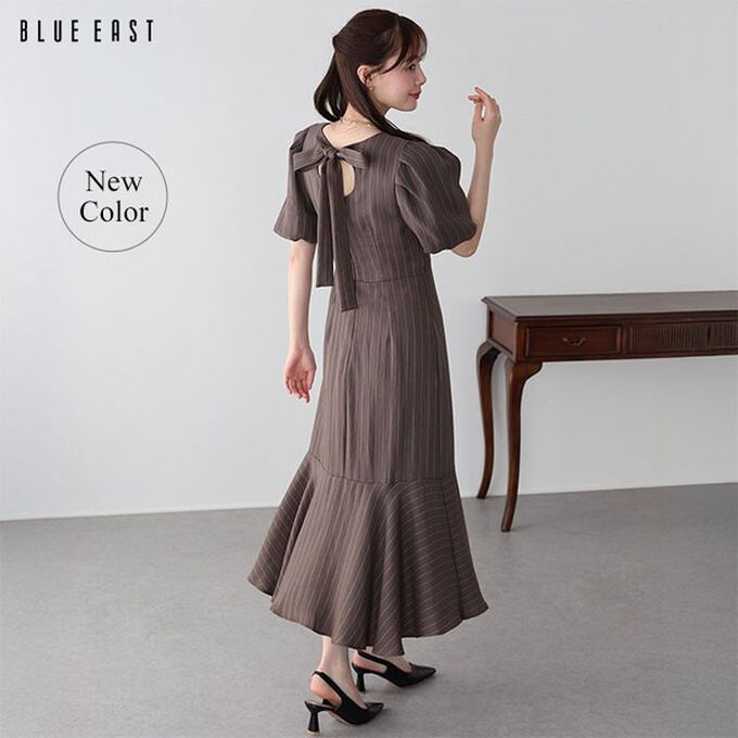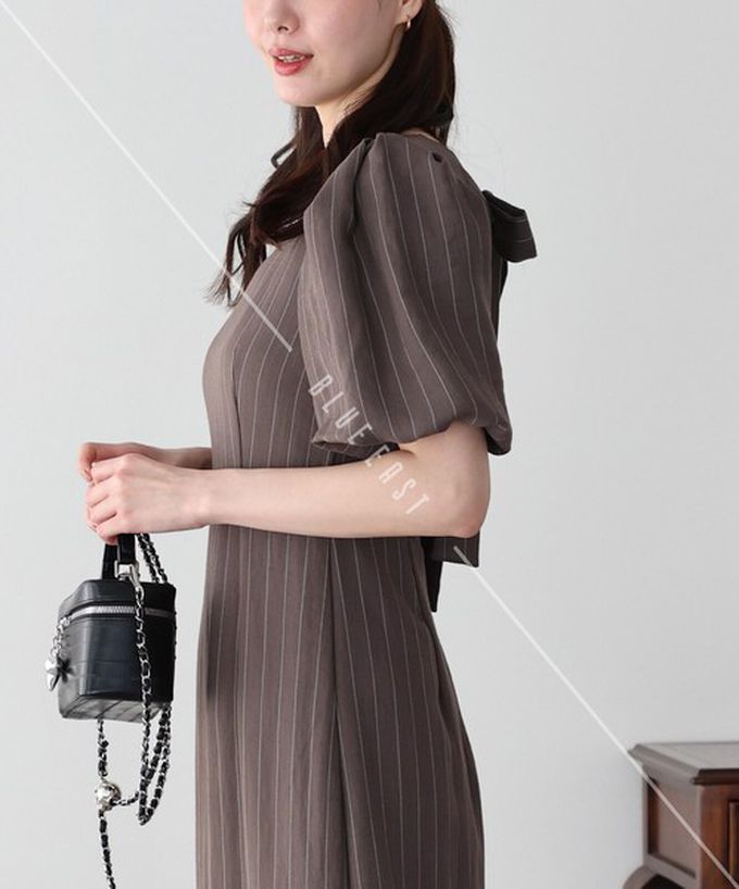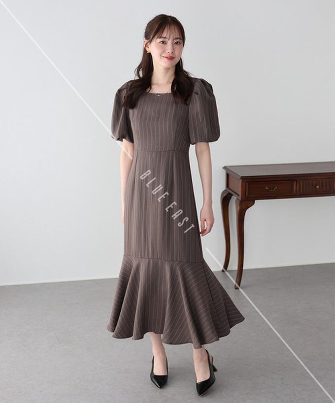日本 BLUE EAST - 優雅方領後綁帶泡泡袖魚尾洋裝-條紋-咖啡 (M)