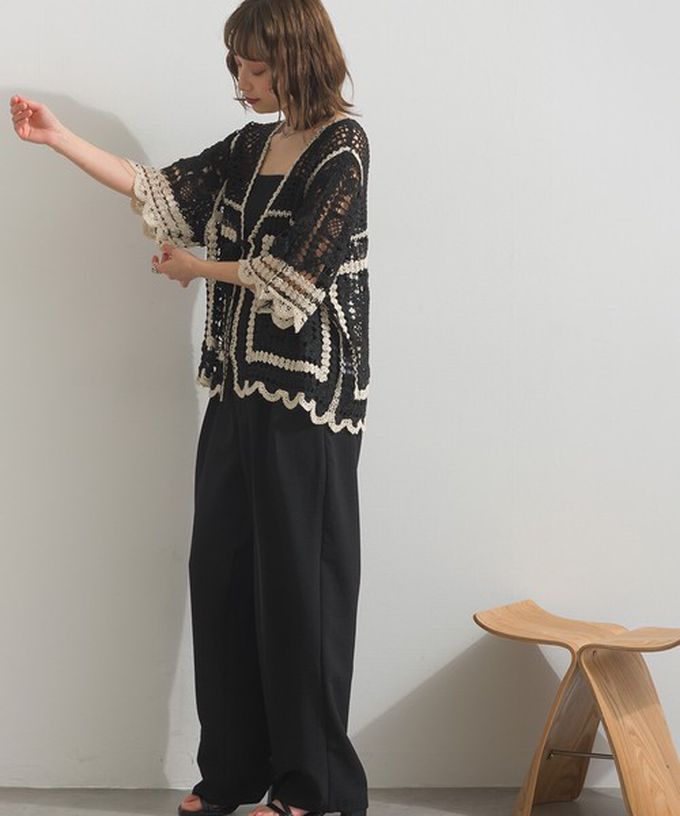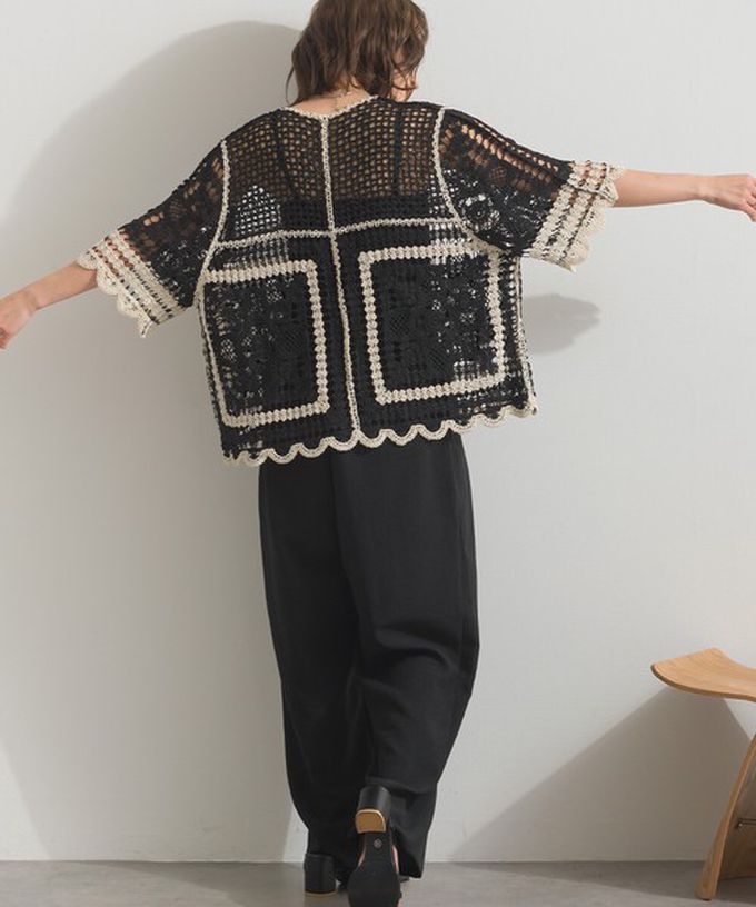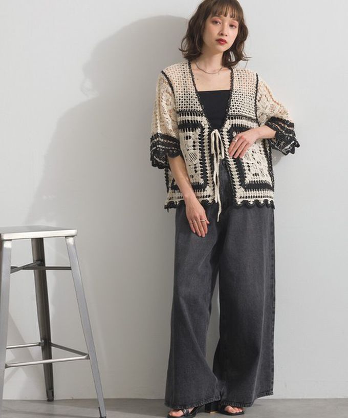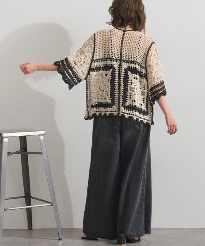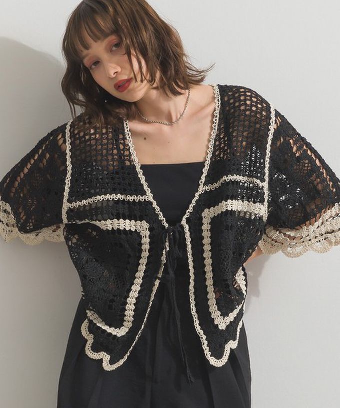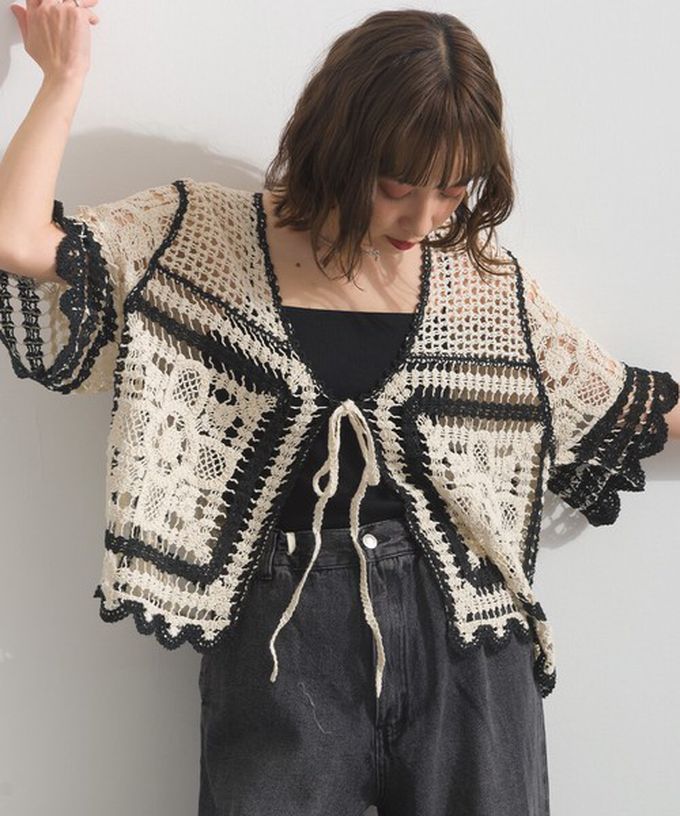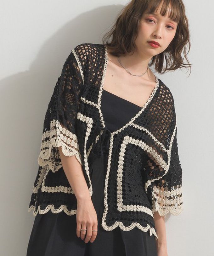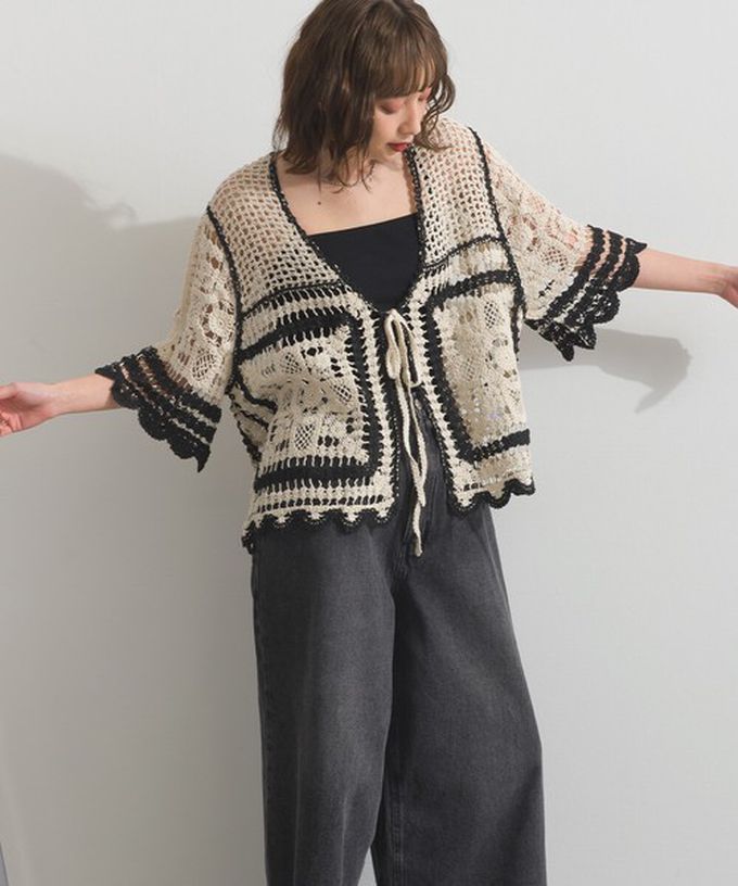 日本 ELENCARE DUE - 纖細扇形鉤針編織綁帶開襟衫-象牙米x黑