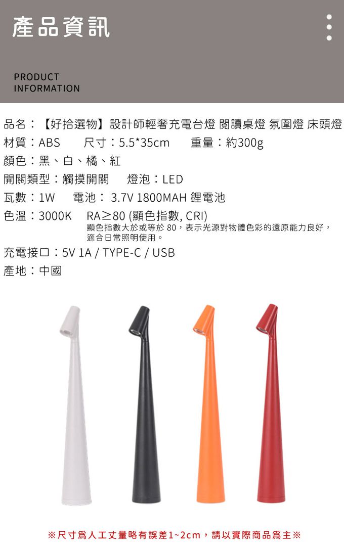 成分:開關類型:觸摸 開關燈泡:LED 瓦數:1W 電池:3.7V 1800MAH 鋰電池 色溫:3000K RA≥80(顯色指數,CRI) 顯色指數大於或等於80,表示光源對物體色彩的還原能力良好,適合日常照明使用。 充電接口:5V1A/TYPE-C/USB