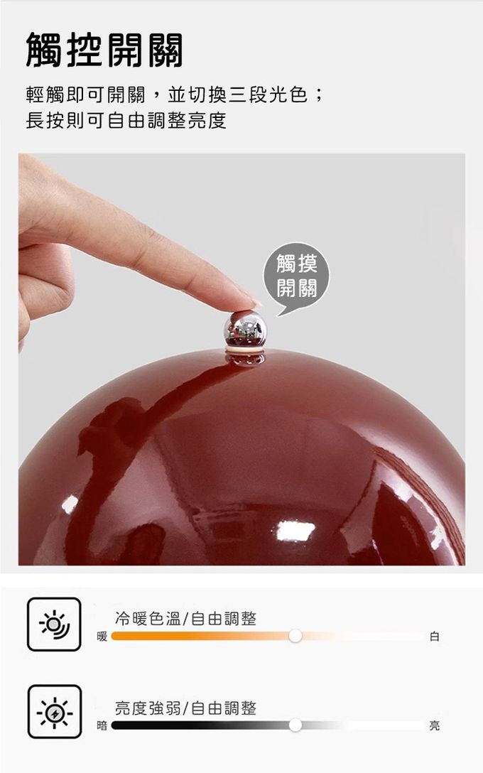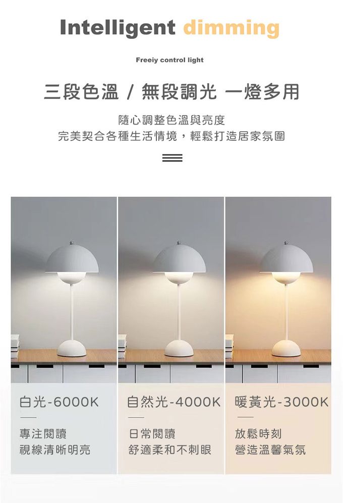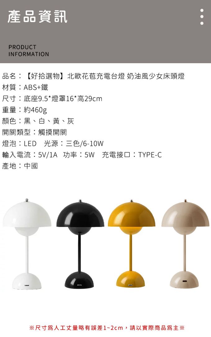 成分:顏色:黑、白、黃、灰開關類型:觸摸開閼 燈泡:LED 光源:三色/6-10W 輸入電流:5V/1A 功率:5W 充電接口:TYPE-C