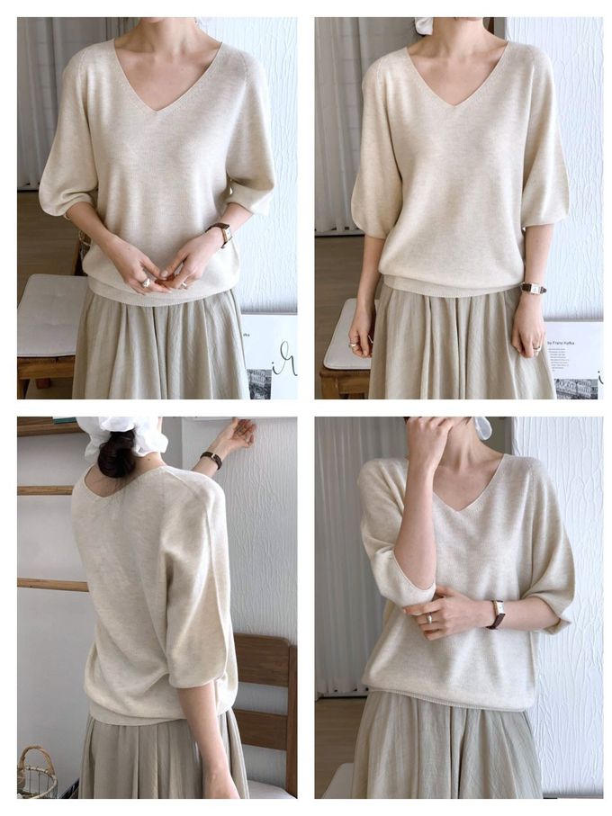 • 品名:韓製 羊毛混絲V領無縫針織五分袖上衣