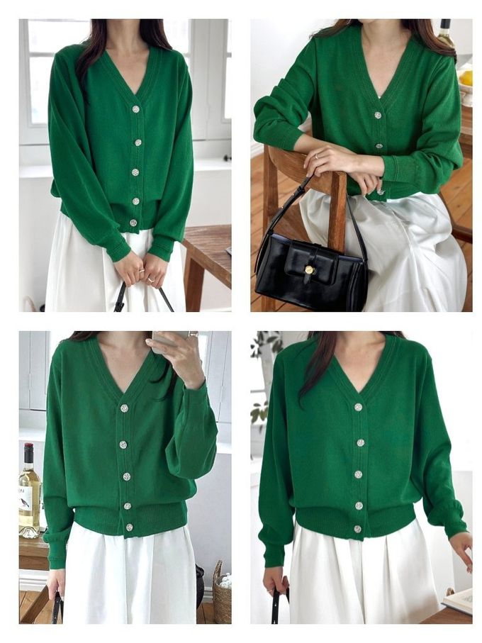 韓國女裝連線 - 韓製 清爽棉麻鑽石釦V領針織外套-森林綠 (FREE)