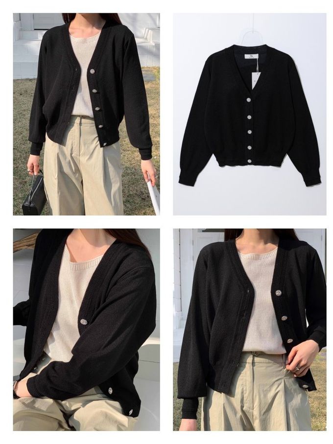 韓國女裝連線 - 韓製 清爽棉麻鑽石釦V領針織外套-黑 (FREE)