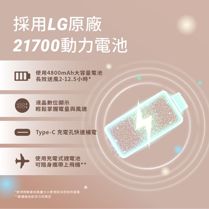 供電資訊:4,800mAh (3.7V, 17.76Wh) / LG原廠 21700 鋰離子圓柱電池