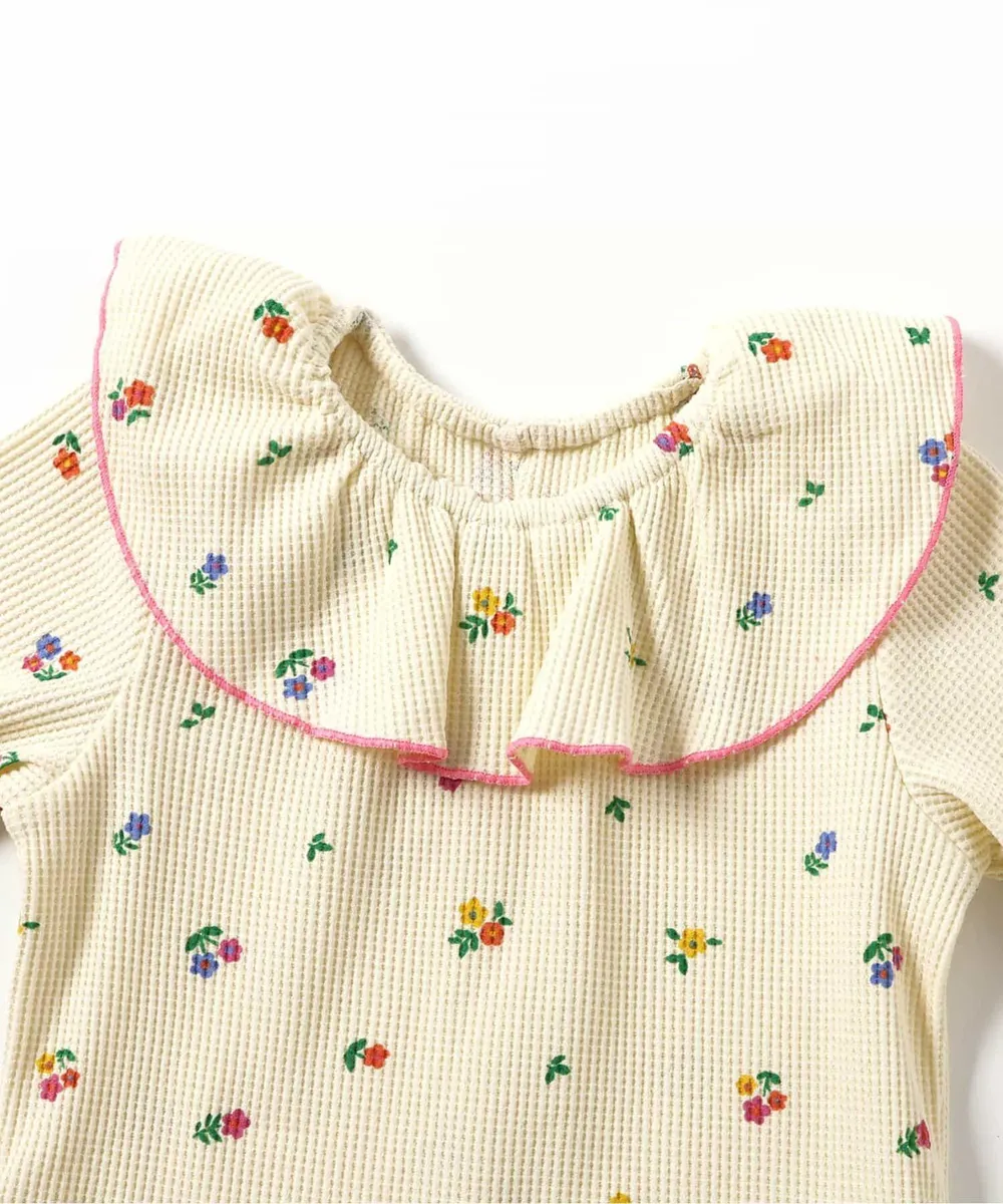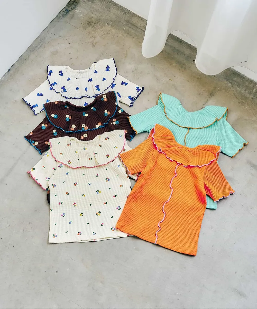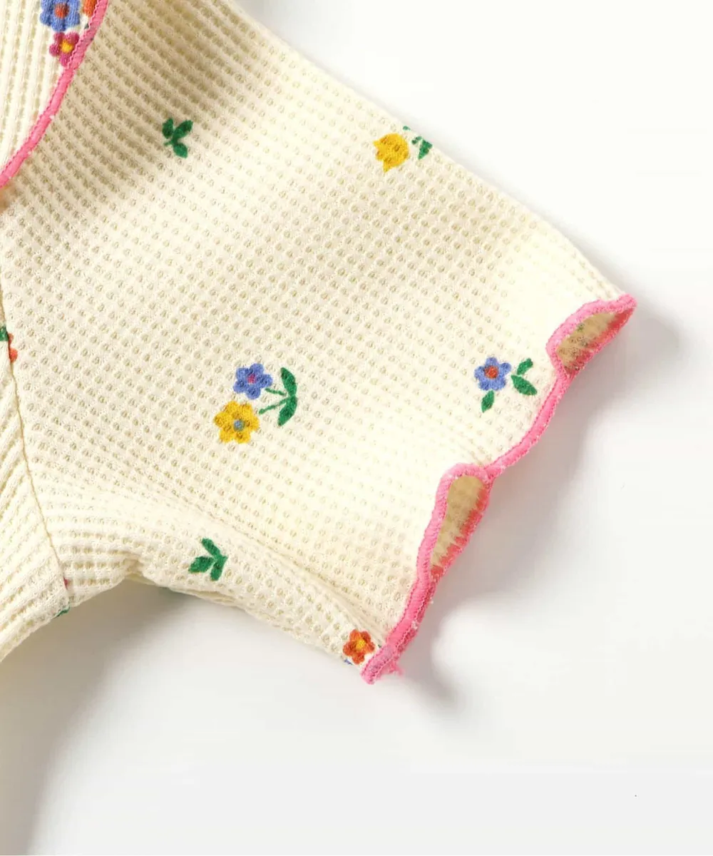 日本 apres les cours - 浪漫捲邊荷葉領華夫格短袖上衣-花束-咖啡