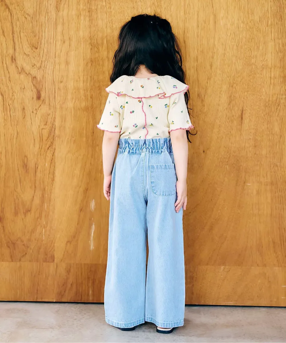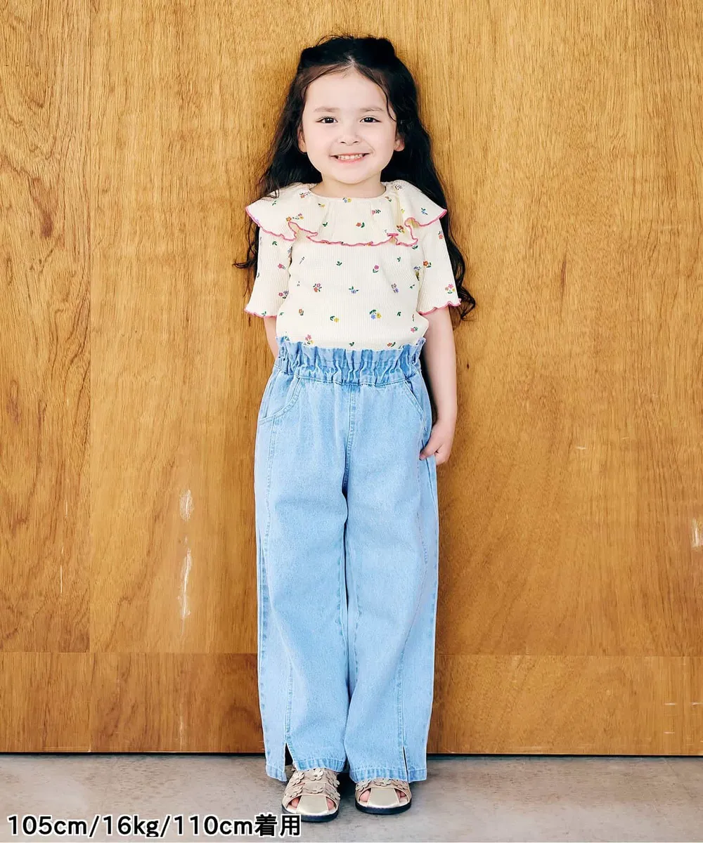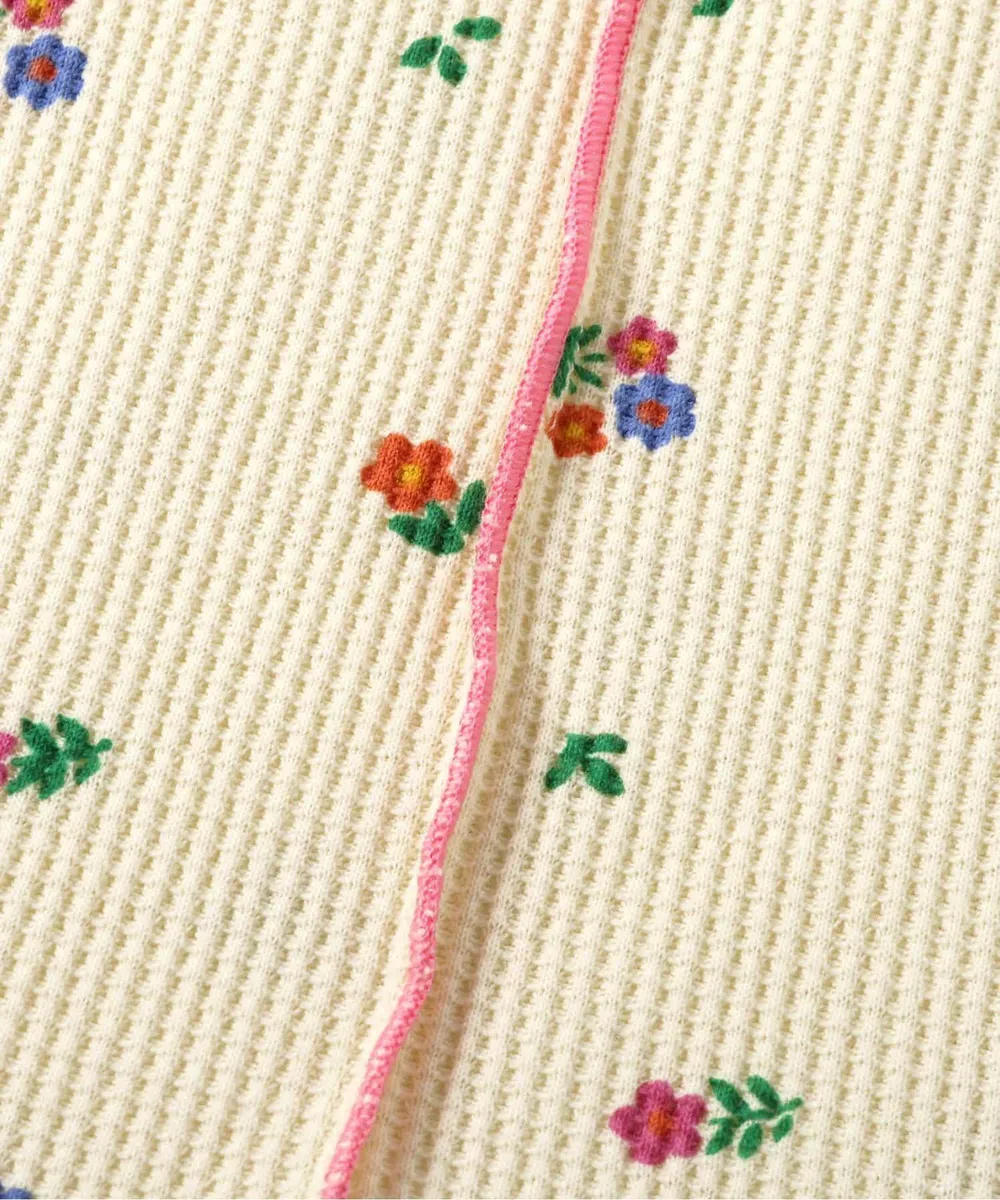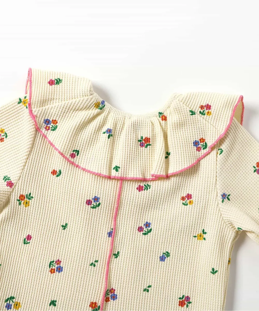 日本 apres les cours - 浪漫捲邊荷葉領華夫格短袖上衣-花束-咖啡