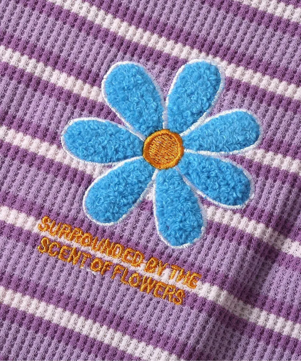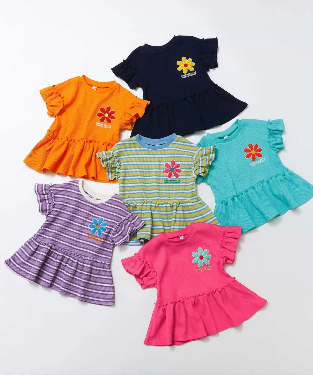 日本 apres les cours - 胸前花朵可愛摺邊短袖上衣-條紋-黃