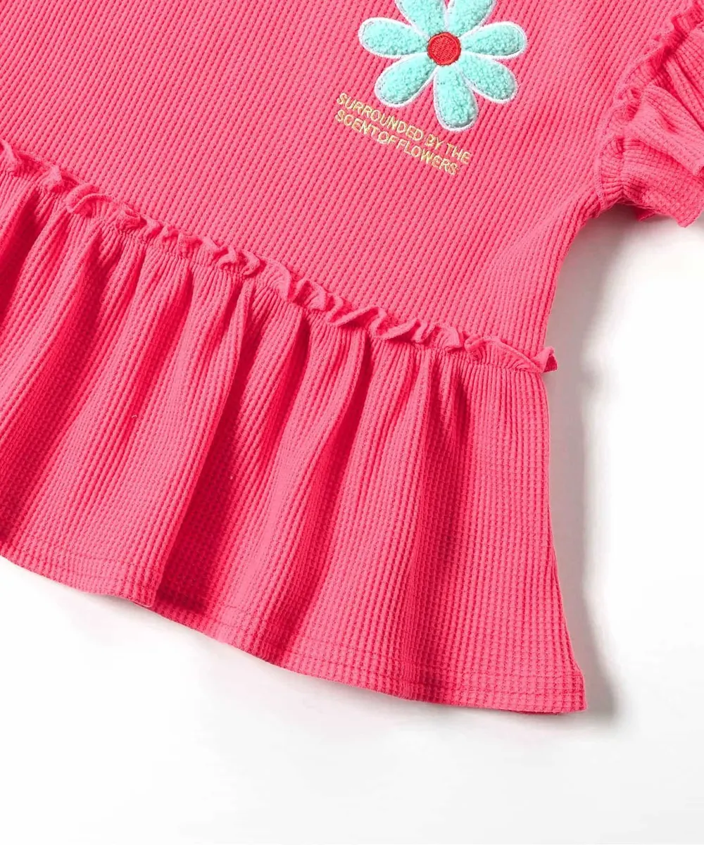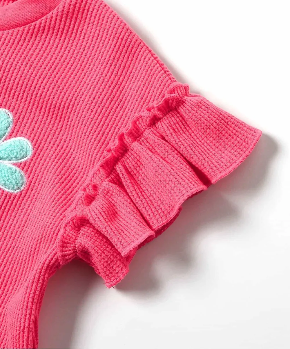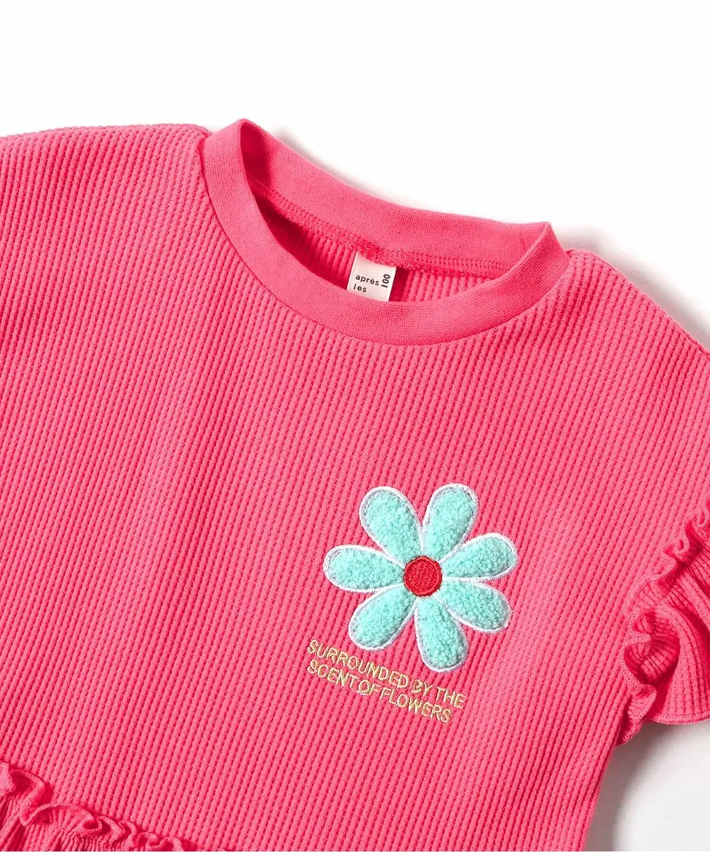 • 品名:胸前花朵可愛摺邊短袖上衣