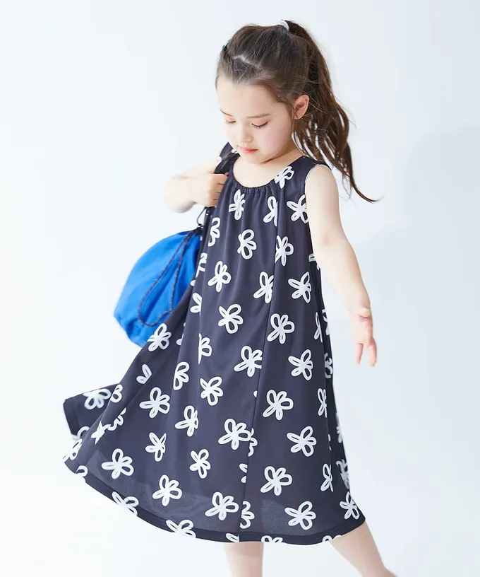 日本 devirock - 涼感速乾網眼 可愛印花無袖洋裝-線條花朵-黑