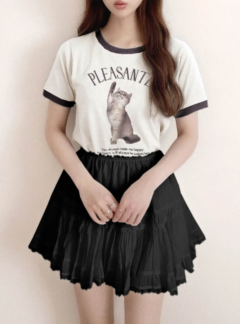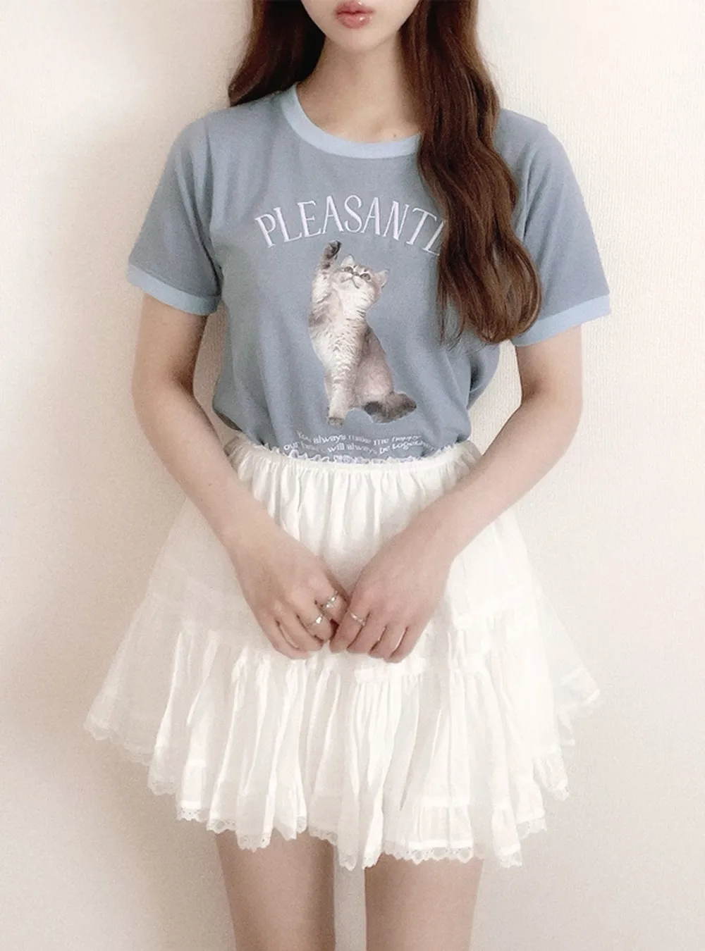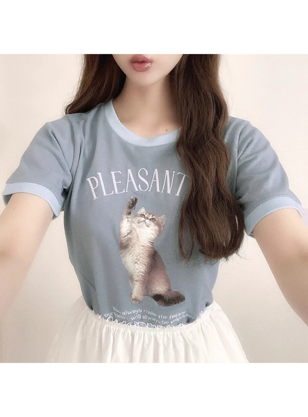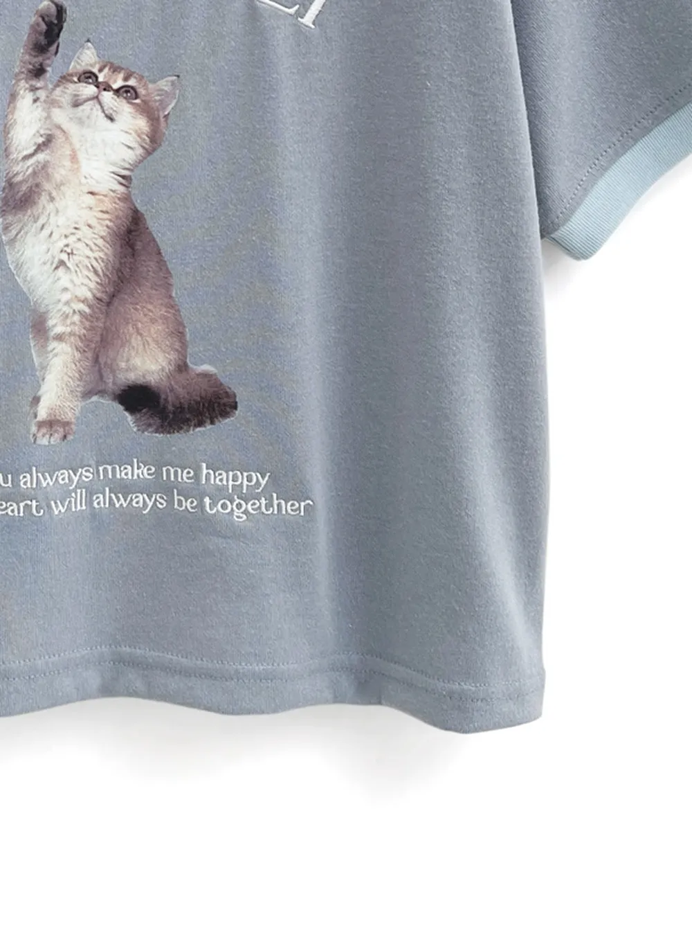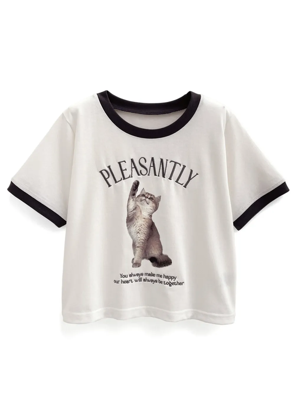 • 品名:淘氣貓咪印花滾邊短袖上衣