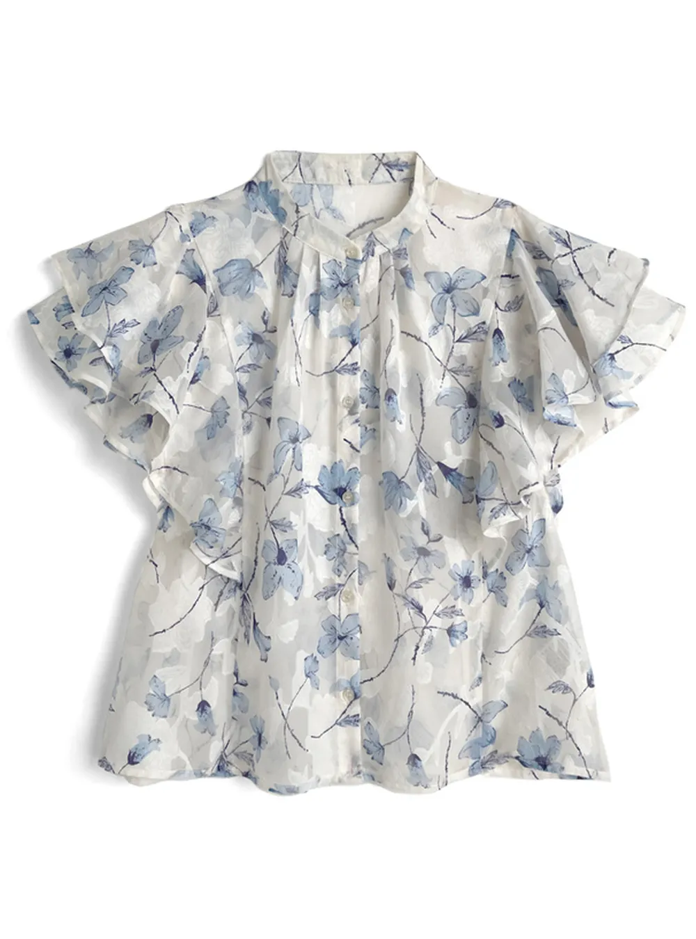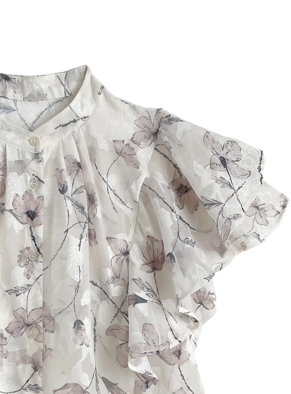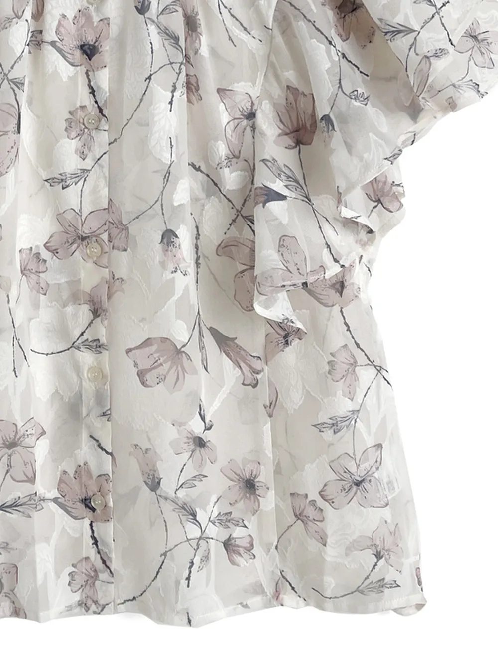 • 品名:浪漫花卉薄紗感荷葉短袖襯衫