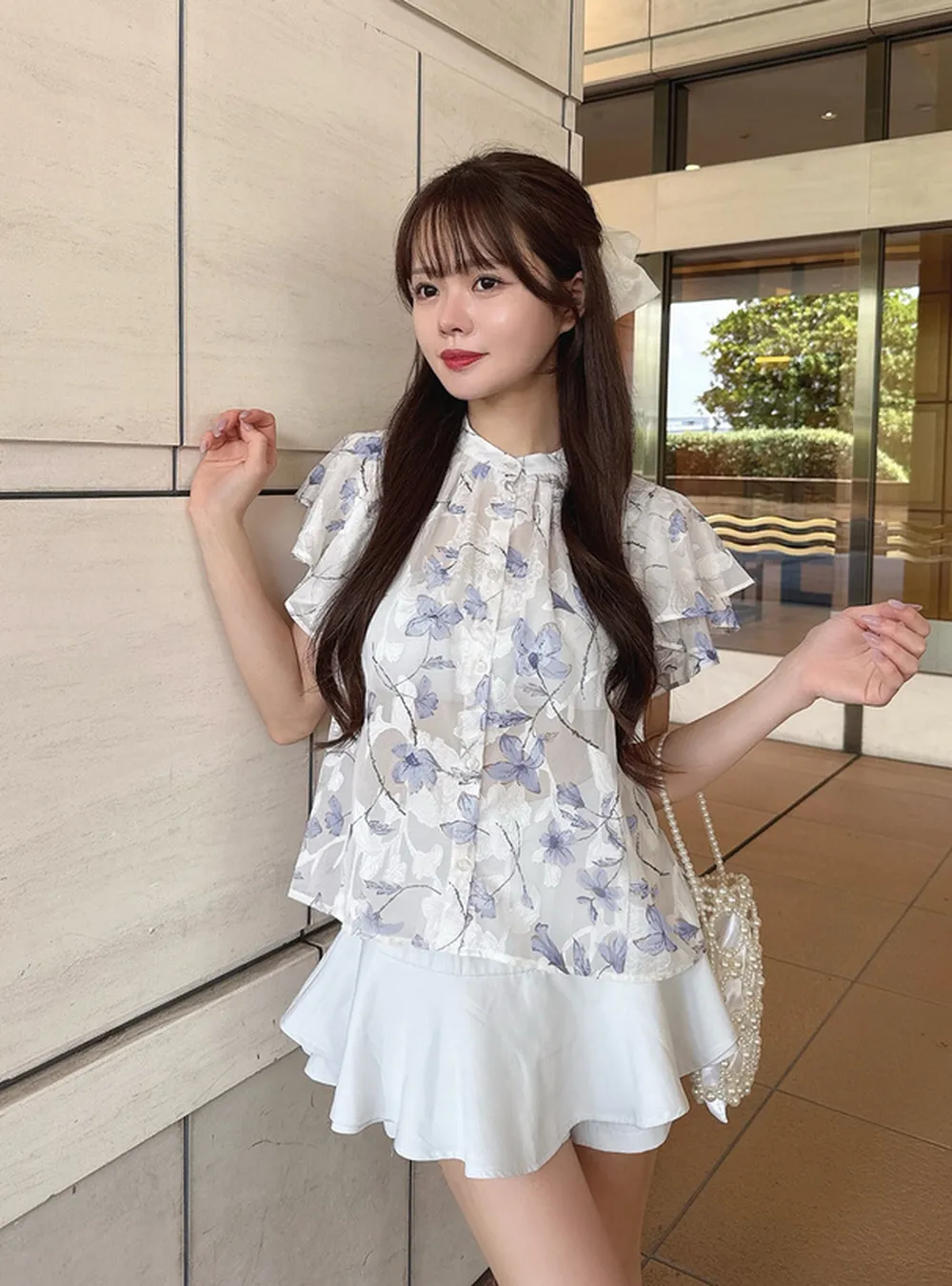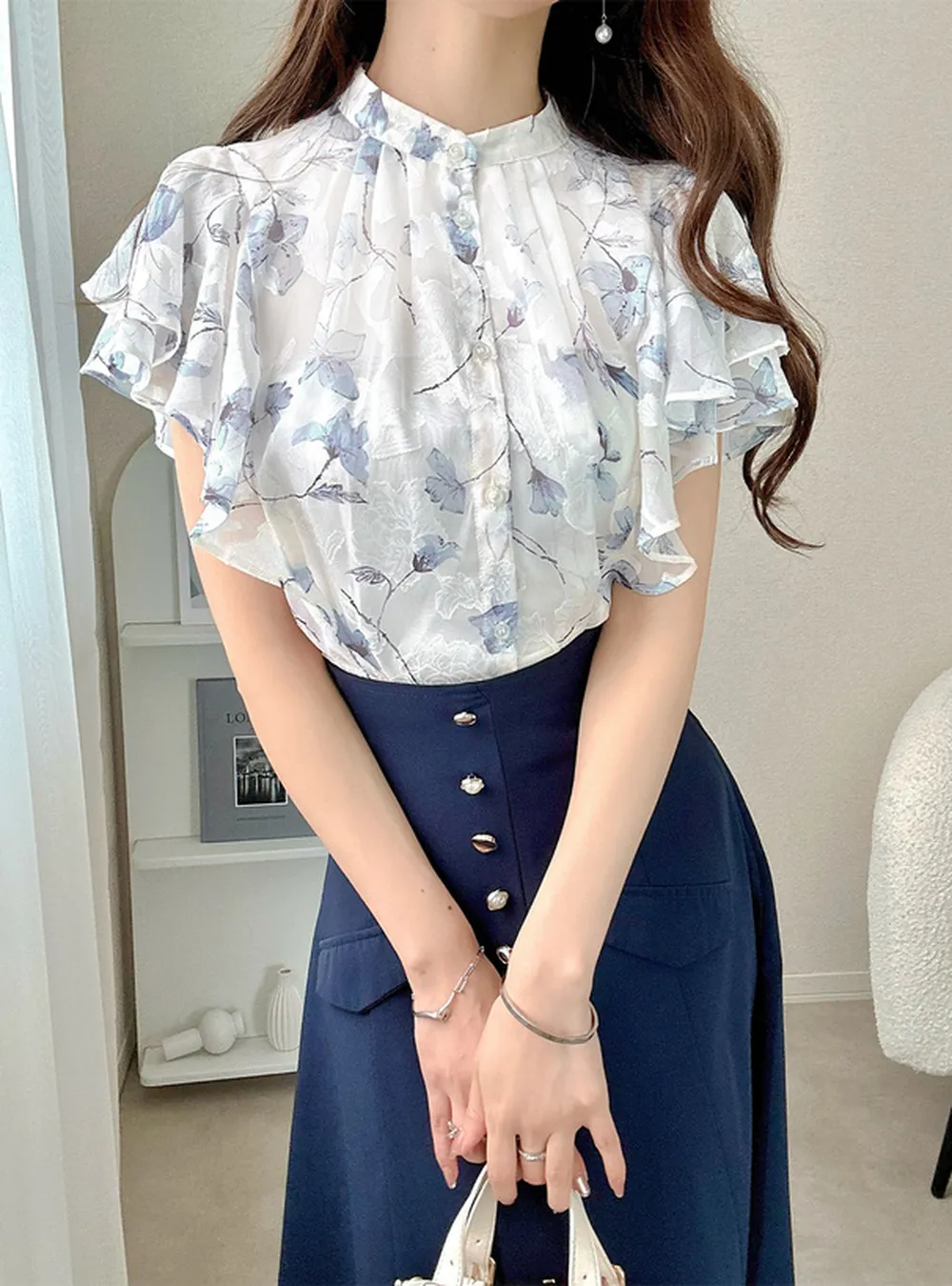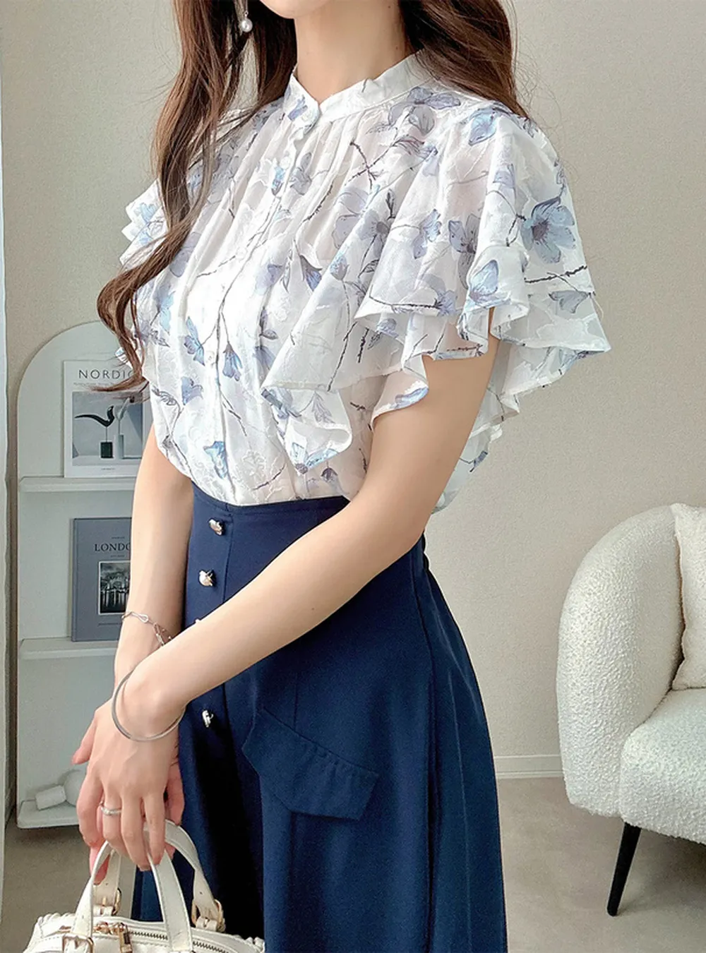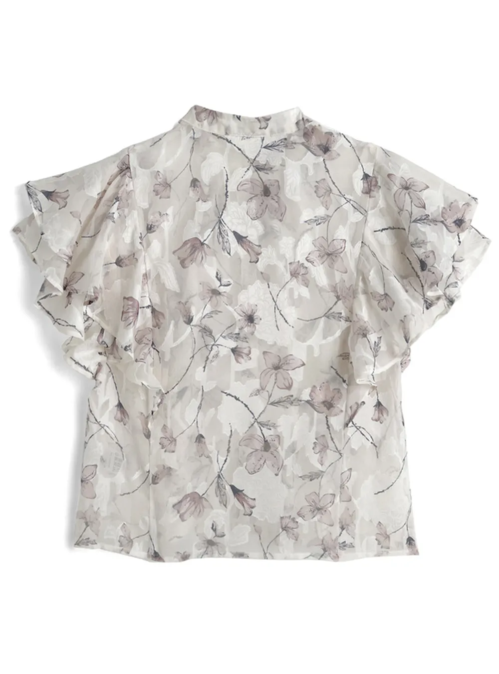 • 品名:浪漫花卉薄紗感荷葉短袖襯衫