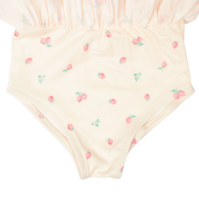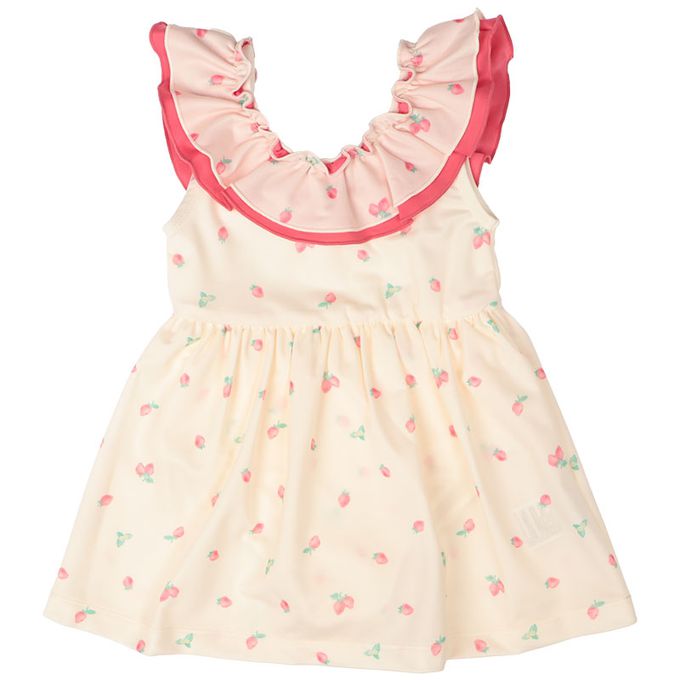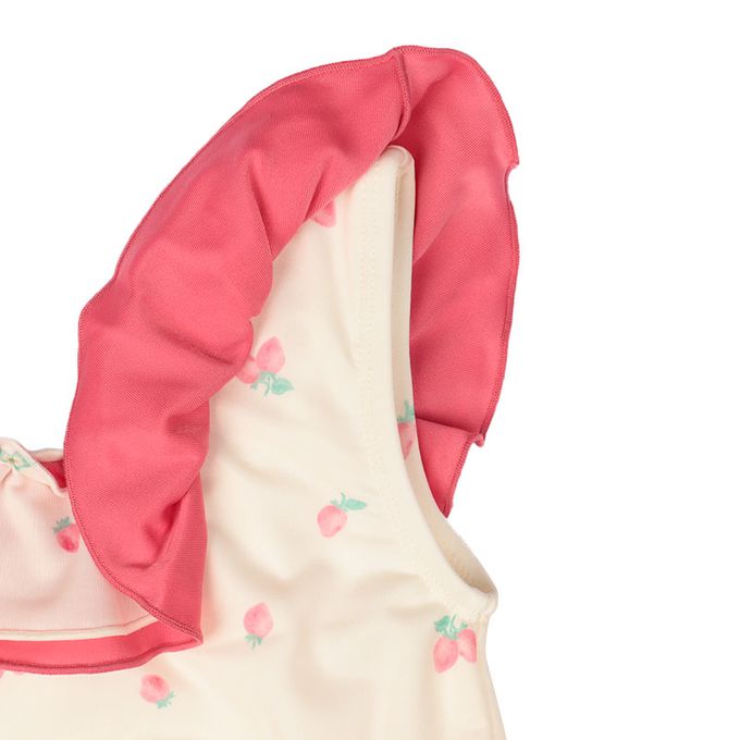 滿版草莓圖案的連身泳衣,領口處有抓皺設計