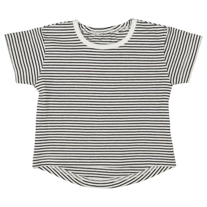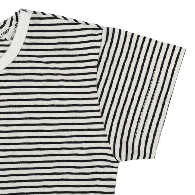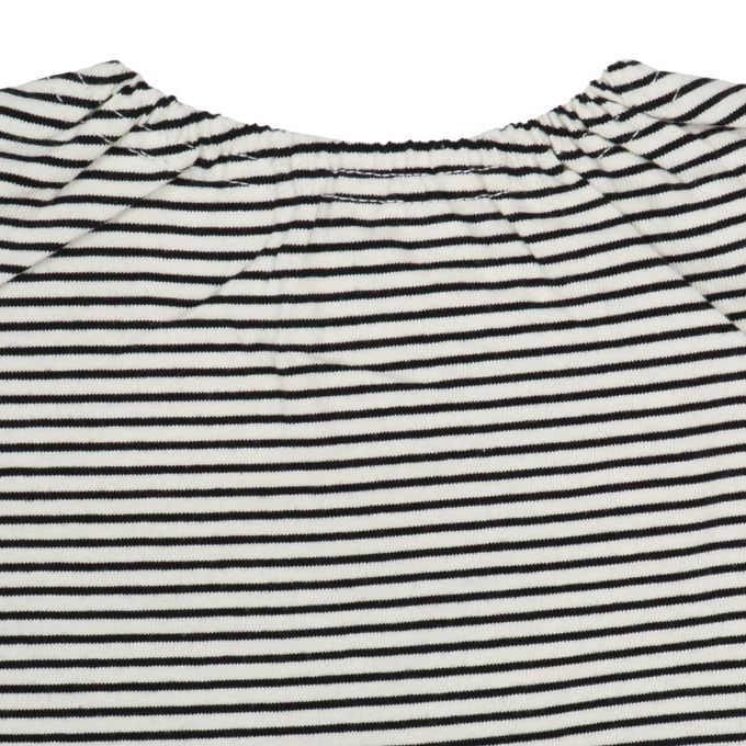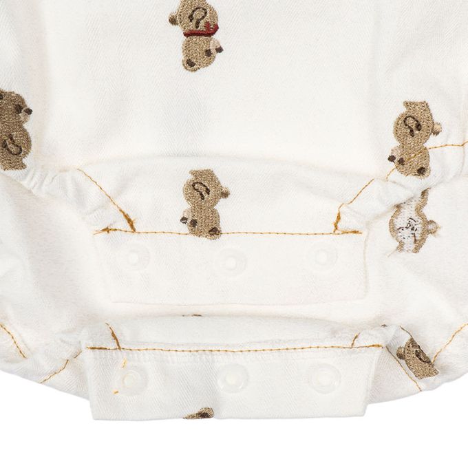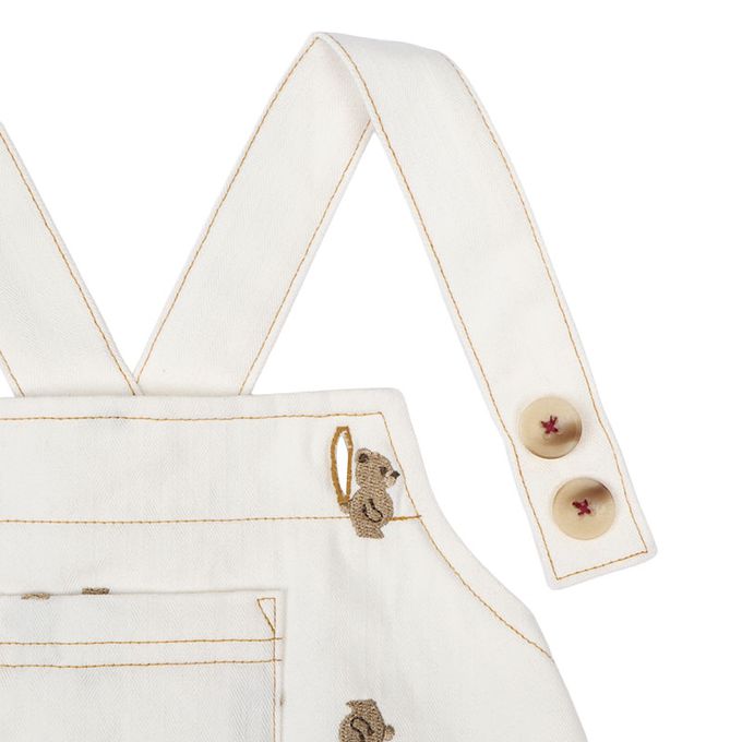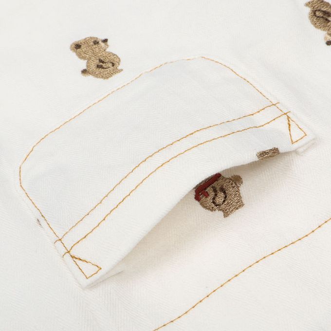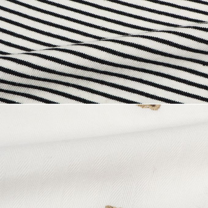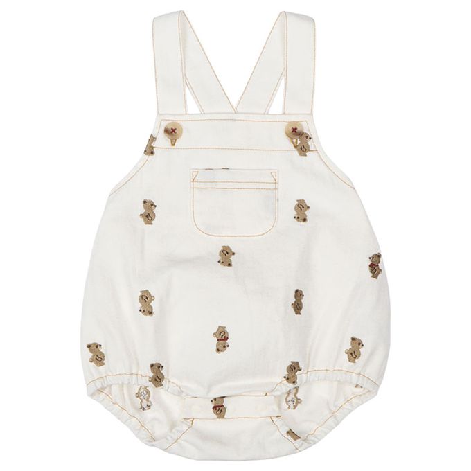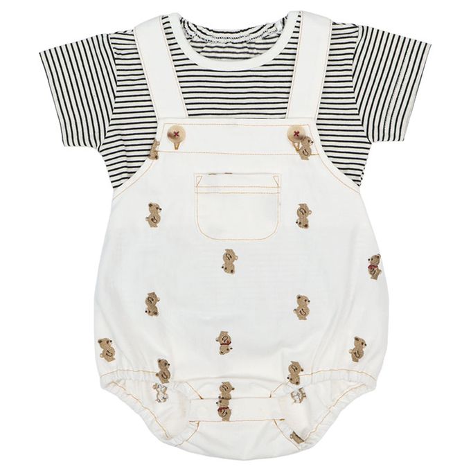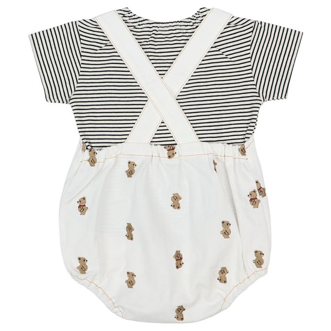 短袖條紋T恤搭配滿版小熊刺繡吊帶褲