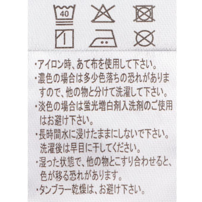 注意事項:●標示內容遵照台灣法規之規定。●請使用不含螢光增白劑的洗劑。●請勿在潮濕的狀態下長時間密封放置。●熨燙請使用墊布。