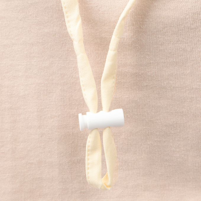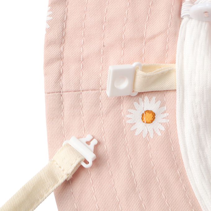 將帽子後面的調節帶拉緊,即可調整頭圍。有附外出活動時非常需要的可拆卸防曬遮陽布。下巴有固定繩可防止被風等吹落。固定繩一側在受到強力拉扯時會脫落,另一側為掛鉤扣。