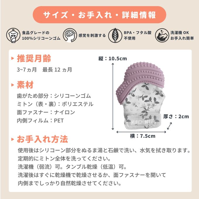 左右手皆可帶。・內有會發出沙沙聲的薄膜,吸引小寶寶的興趣。・可用洗衣機清洗,非常容易保養
