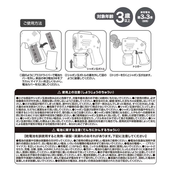 注意事項:●本產品含有小部件,請勿讓3歲以下幼童觸碰,以免因誤吞造成危險。●請務必由家長或大人陪同使用,並注意避免危險的操作。●請勿使用已受損或變形的產品。●若有小零件脫落,請立即丟棄。●若不慎誤食,請立即吐出並飲用大量的水。●請勿朝人或動物的眼睛、臉部噴射泡泡,以免發生危險。●若泡泡水濺入眼睛,請立即以乾淨的水沖洗。●請在戶外玩泡泡。●若泡泡水沾到衣物或布料上,可能會形成污漬,使用時請小心。●使用泡泡水前,請確認周圍環境,避免對人或物造成損害。●使用後請將泡泡水沖洗乾淨,並在乾燥狀態下保存。●若無法順利噴出泡泡時,請攪拌泡泡水或用剪刀修剪管嘴的長度。●若泡泡水接觸到肌膚,請用水充分清洗。●即使避開高溫潮濕及直射陽光的地方,依使用狀況或保存環境不同,仍有可能因劣化而變色或變形,敬請知悉。●若玩具裝在塑膠袋內或以塑膠膜包裝,開封後請立即將塑膠袋、塑膠膜丟棄,或放置於嬰幼兒無法取得的地方,以免發生窒息的危險。●警告:不適合未滿3歲兒童使用。●請存放於幼兒無法取得的地方。●電池的安裝與更換請由家長或大人進行操作。●使用時請務必使用全新的電池。●為避免電池快速耗電或漏液,請勿將新舊電池或不同種類的電池混合使用。●請依照電池的正負極方向正確地安裝。●嚴禁使用充電式電池(鎳鎘電池等)或鎳氫電池。●請勿讓電池短路、充電、分解、加熱、放入火中。●若電池漏液不慎進入眼睛,請立即以大量清水沖洗,並諮詢醫師;若沾到皮膚或衣物,請以清水清洗。●請注意避免幼童誤吞電池。電池請存放於幼童無法取得的地方。若不慎誤食電池,請立即就醫。●遊玩後請務必將所有電池取出,以免故障或漏液。●請勿將已耗盡的電池長時間裝在本產品中,以免造成電池漏液。