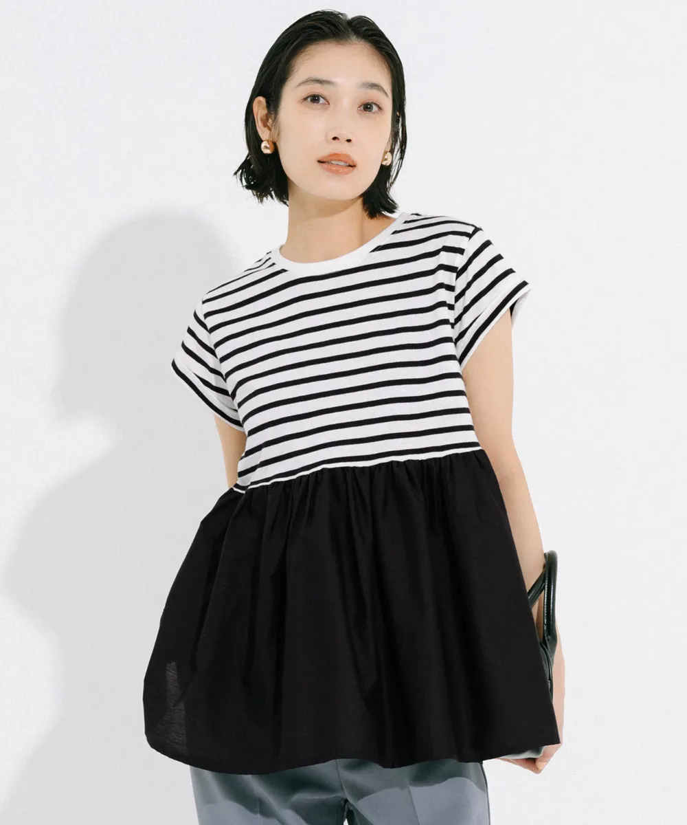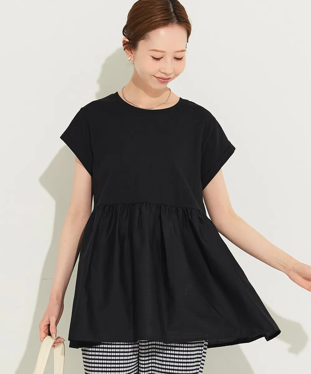 日本 COCA - 簡潔圓領藏肉傘擺短袖上衣-黑