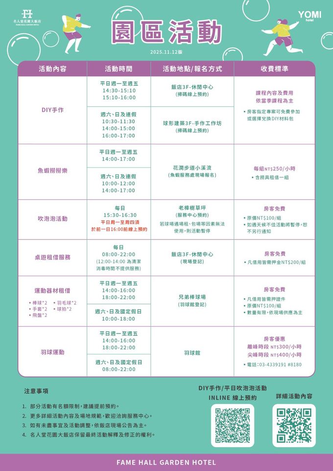 3. 平日週一至週四人住加贈DIY手作課程乙組,另享房型限量升等豪華三人或四人房(隨機不指定),依現場庫存為主。升等不含早餐,第三、四位早餐請至餐廳現場加購。遇旺日、假日、大假日不適用加贈與升等優惠。