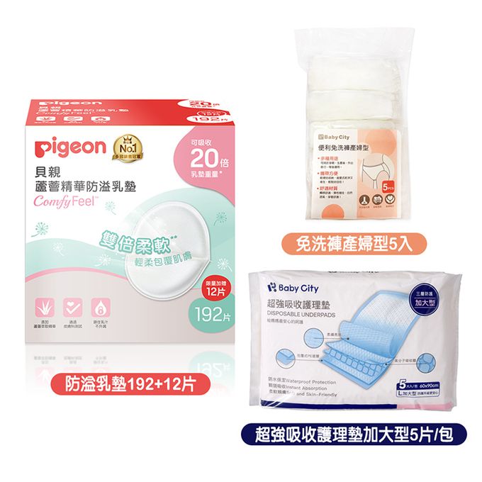 蘆薈精華防溢乳墊192+12片+Babycity便利免洗褲產婦型5入+超強吸收護理墊加大型5片/包
