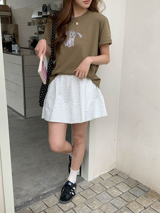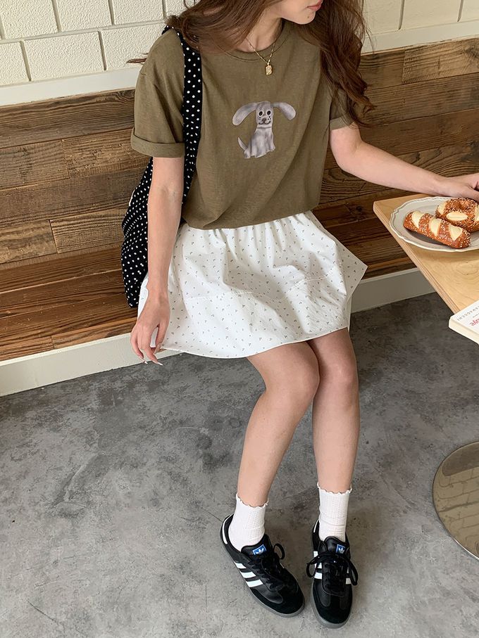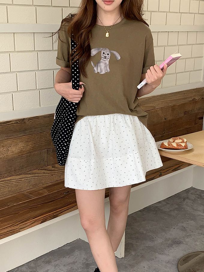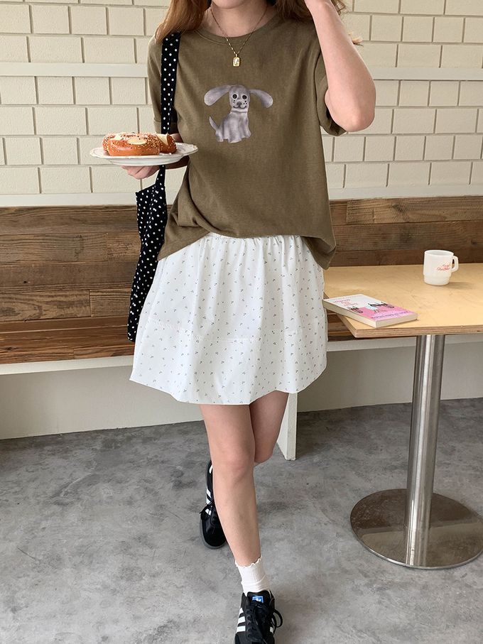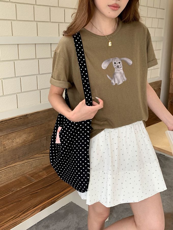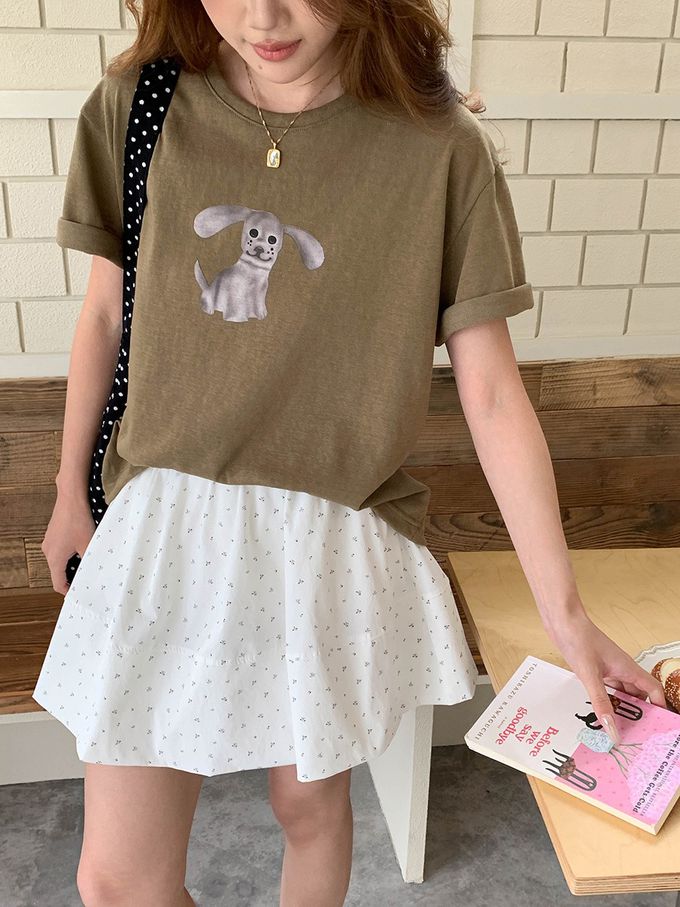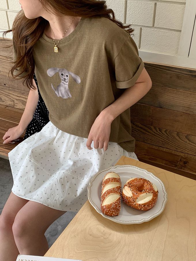 3th Morning - 寬鬆落肩短袖上衣-趣味卡通小狗-軍綠 (F)