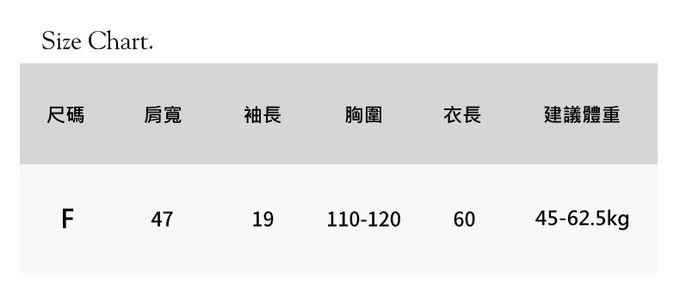1. 尺寸表單位皆為公分(cm),商品皆為平鋪測量,實際尺寸會因布料彈性、水洗、測量起迄點等因素略有誤差,敬請諒解。
