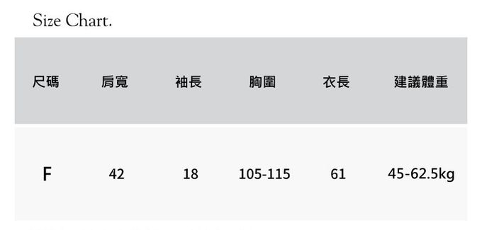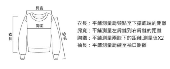 1. 尺寸表單位皆為公分(cm),商品皆為平鋪測量,實際尺寸會因布料彈性、水洗、測量起迄點等因素略有誤差,敬請諒解。