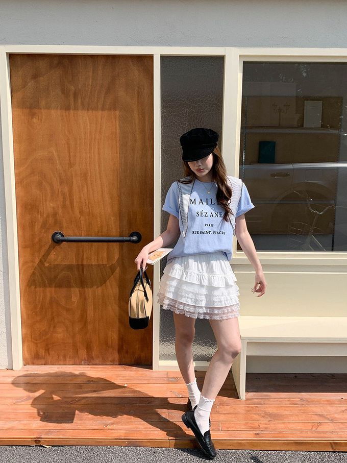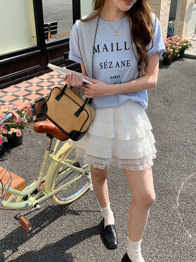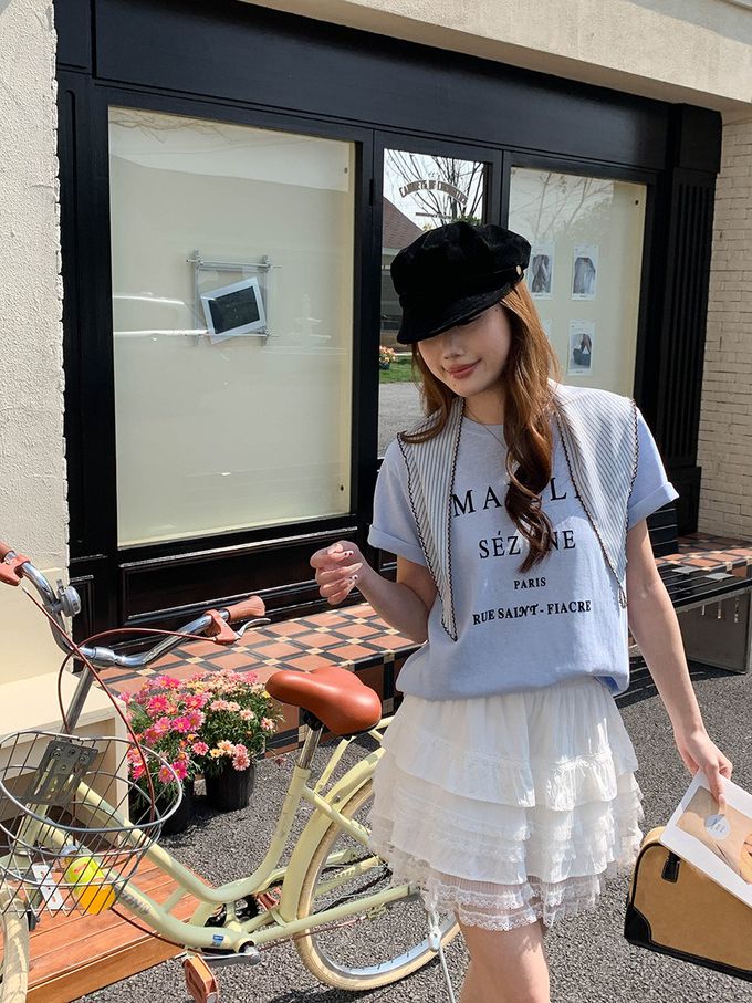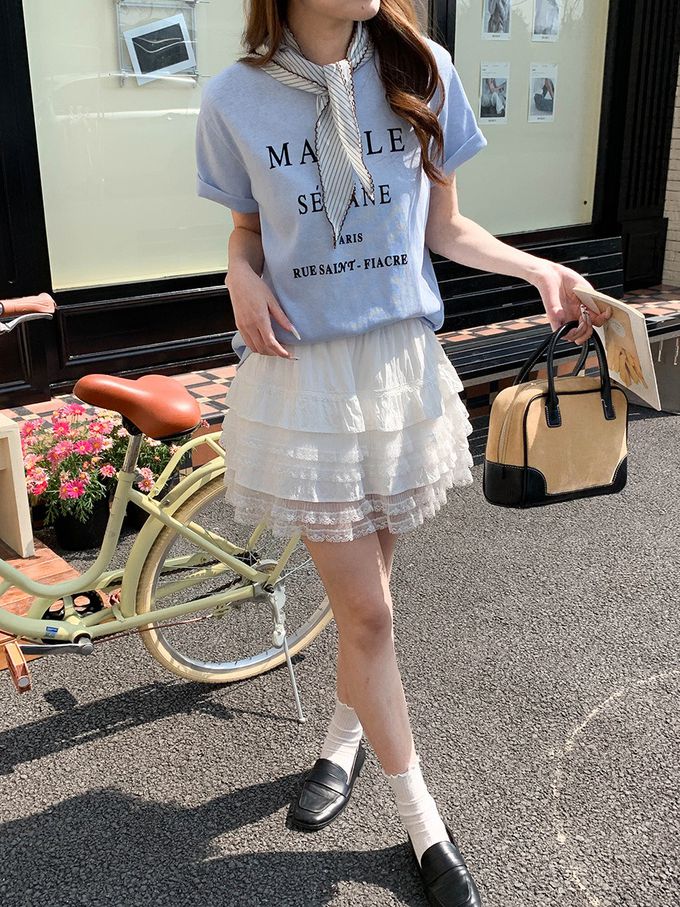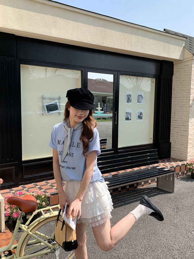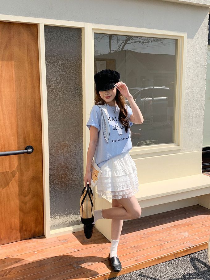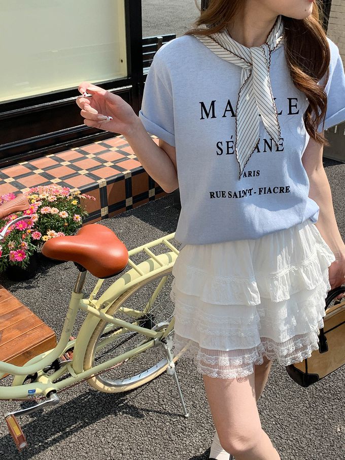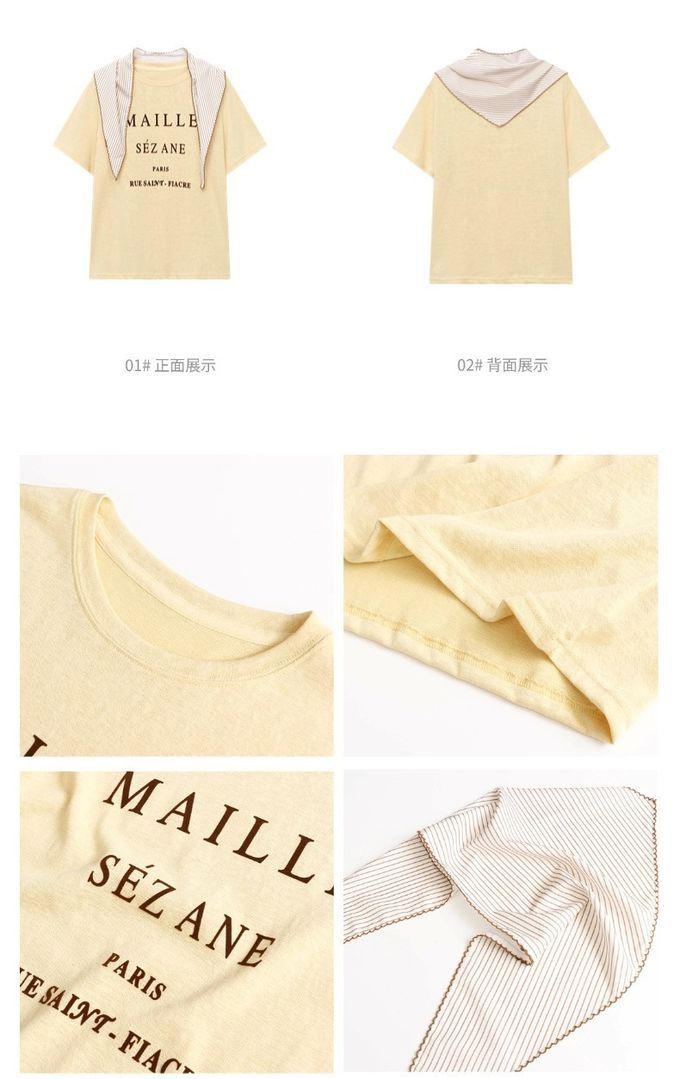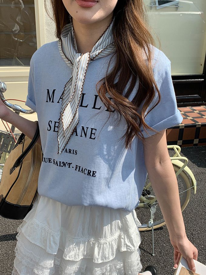 3th Morning - (附絲巾)寬鬆正肩短袖上衣-簡約字母-淺藍 (F)