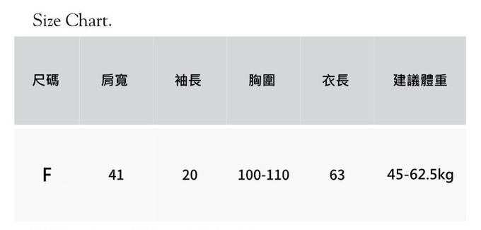 1. 尺寸表單位皆為公分(cm),商品皆為平鋪測量,實際尺寸會因布料彈性、水洗、測量起迄點等因素略有誤差,敬請諒解。