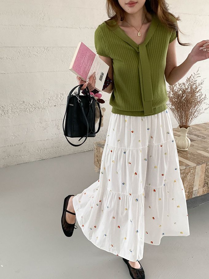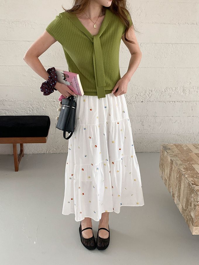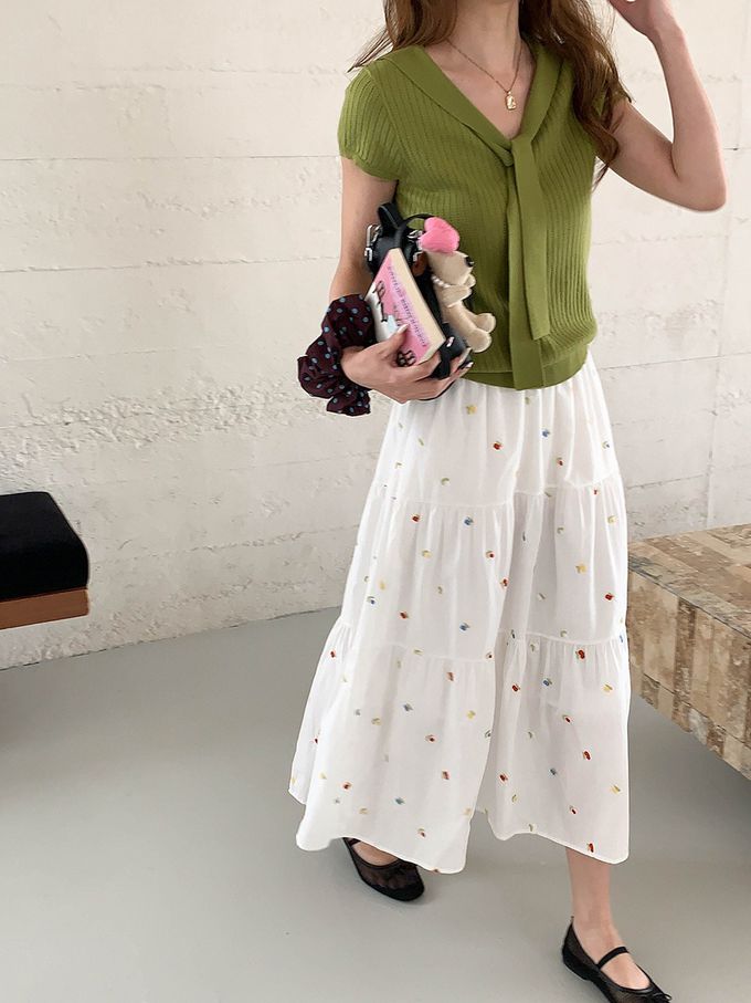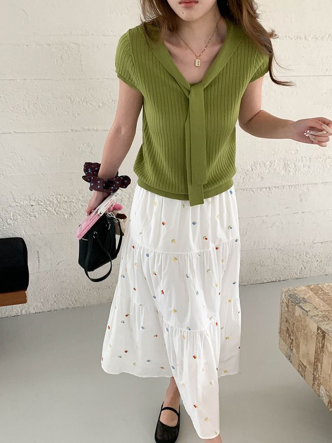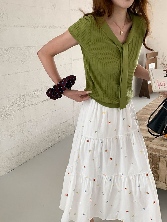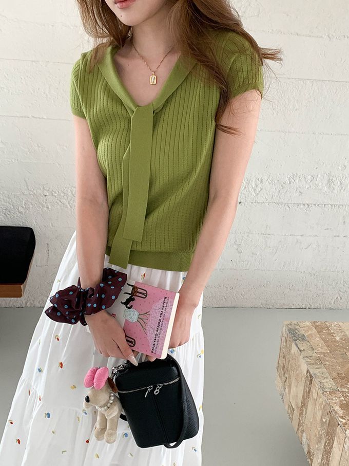 • 品名:溫柔V領綁帶短袖針織衫