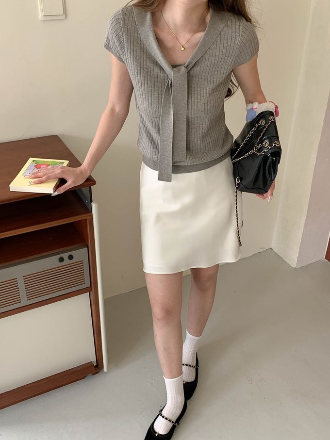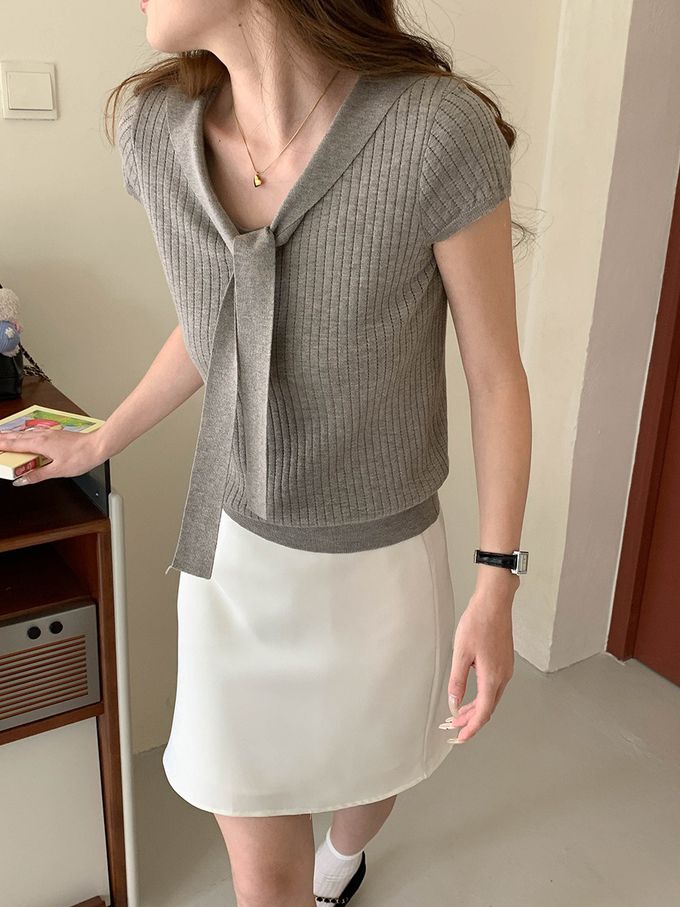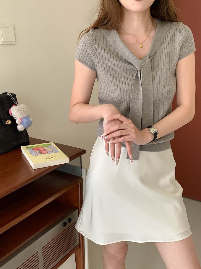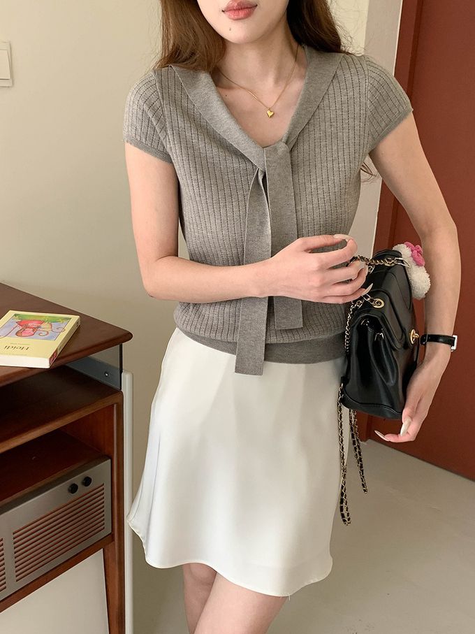 3th Morning - 溫柔V領綁帶短袖針織衫-灰 (F)
