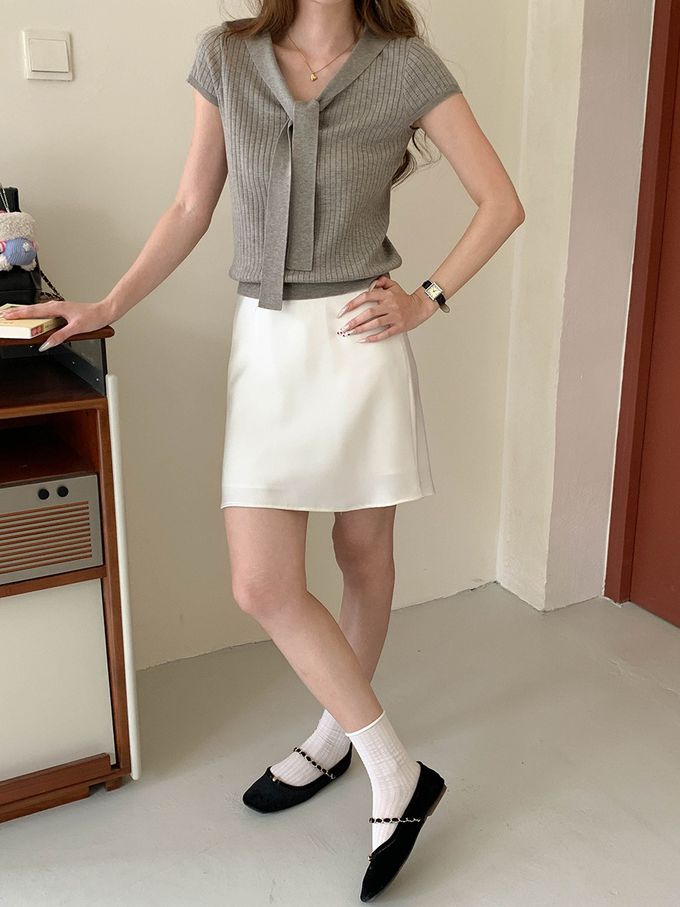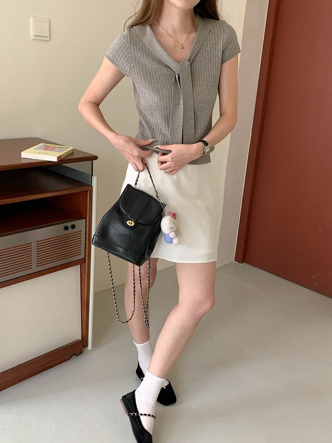 • 品名:溫柔V領綁帶短袖針織衫
