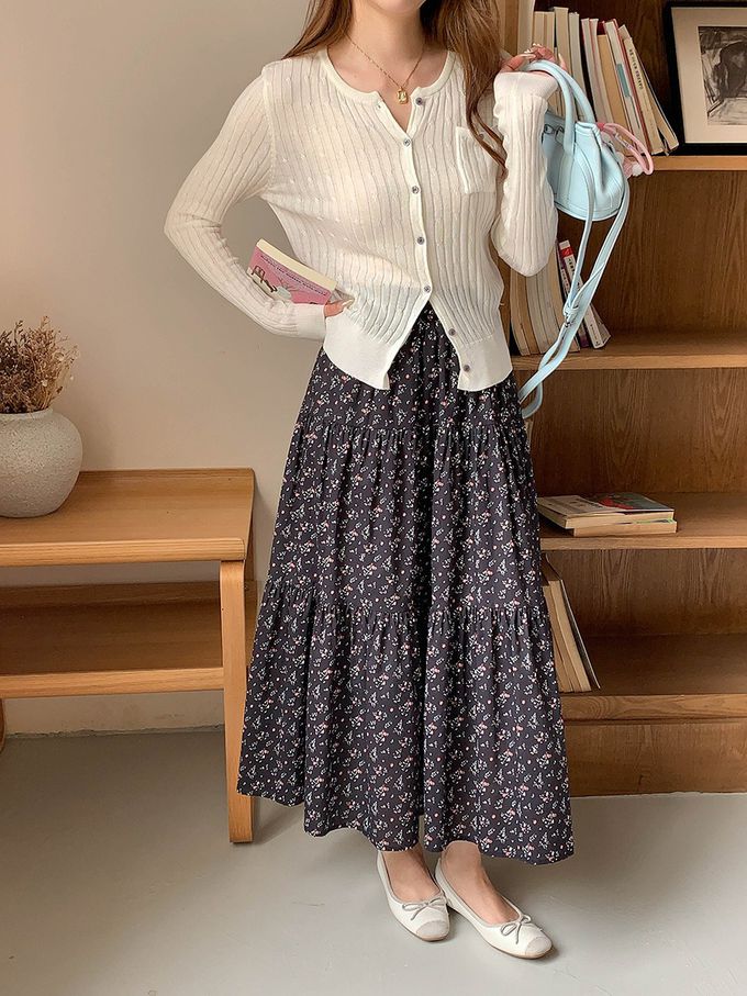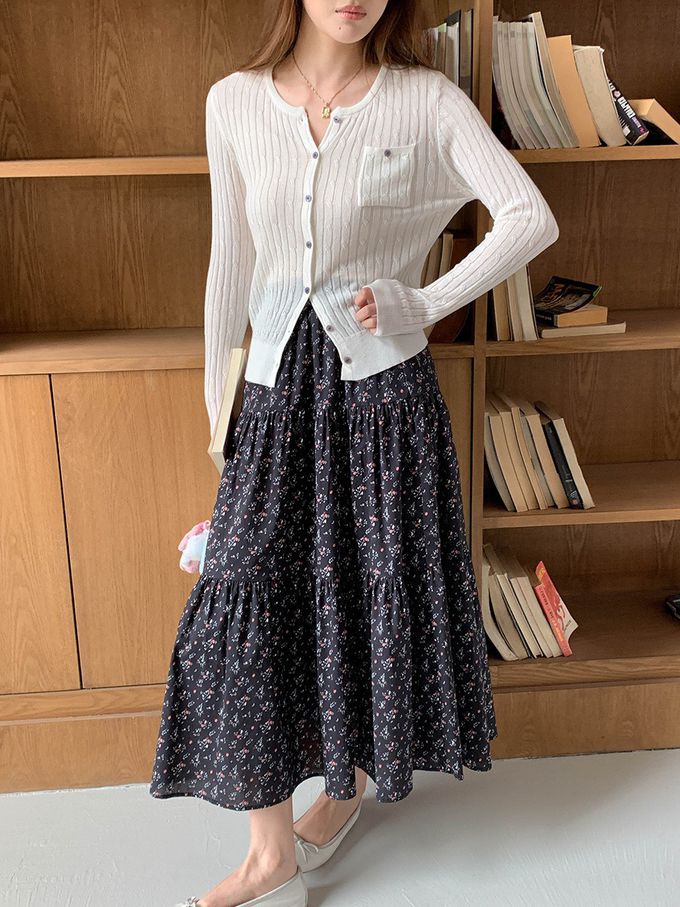 3th Morning - 顯瘦A字碎花印蛋糕長裙-黑 (F)