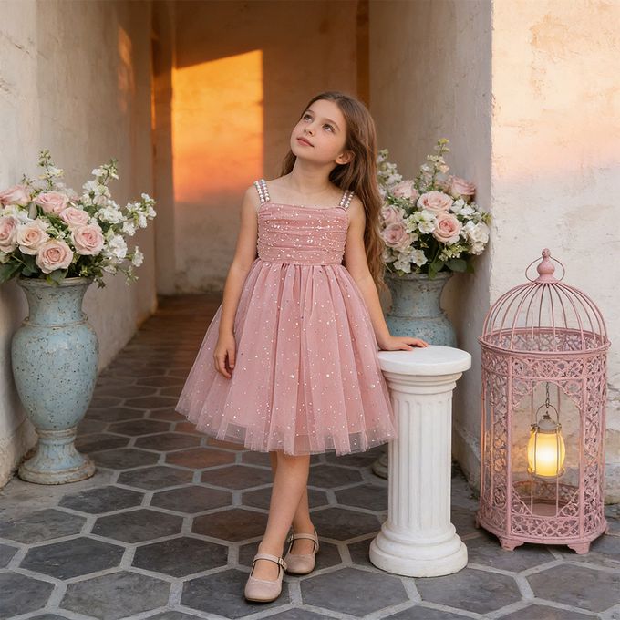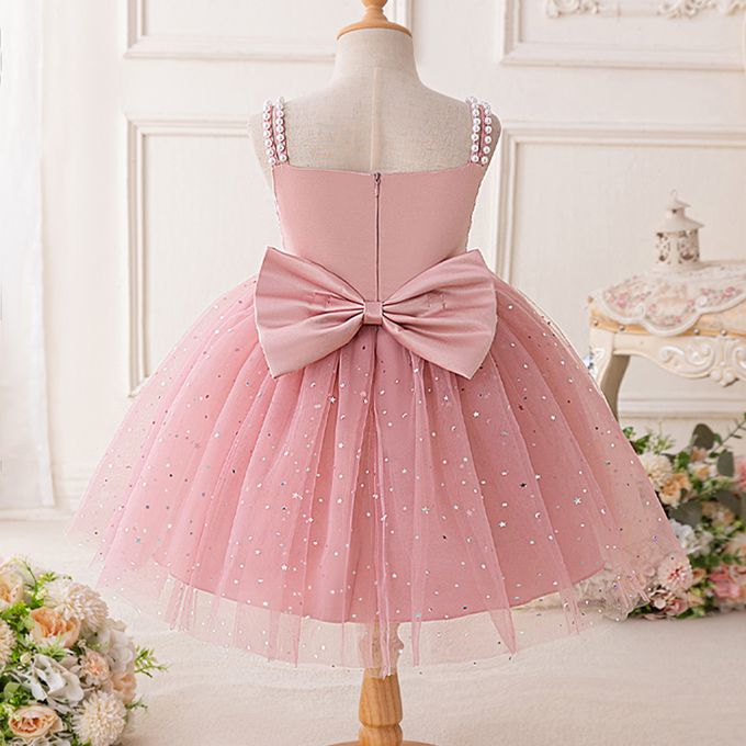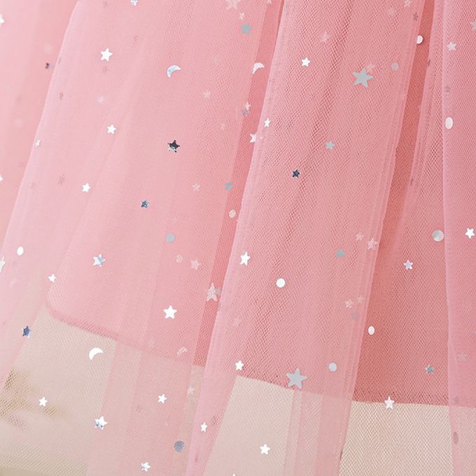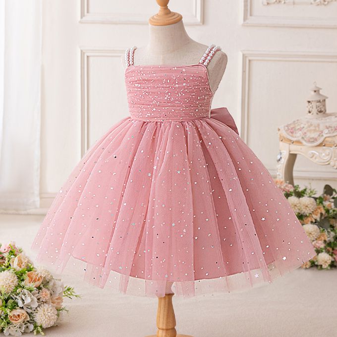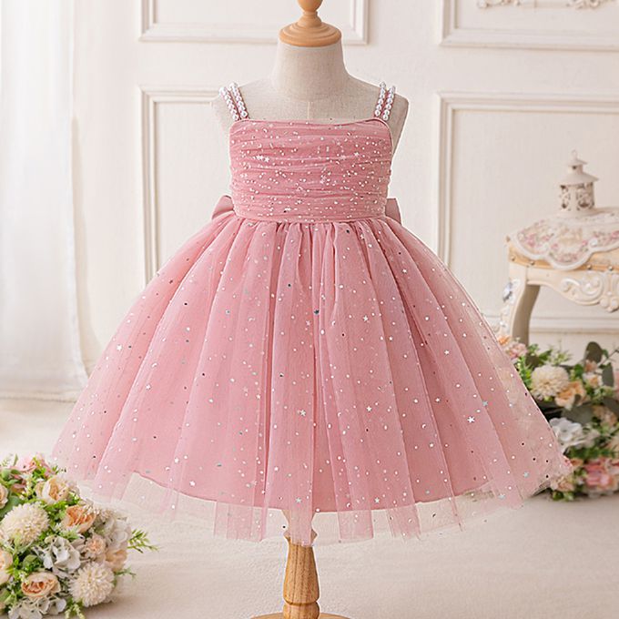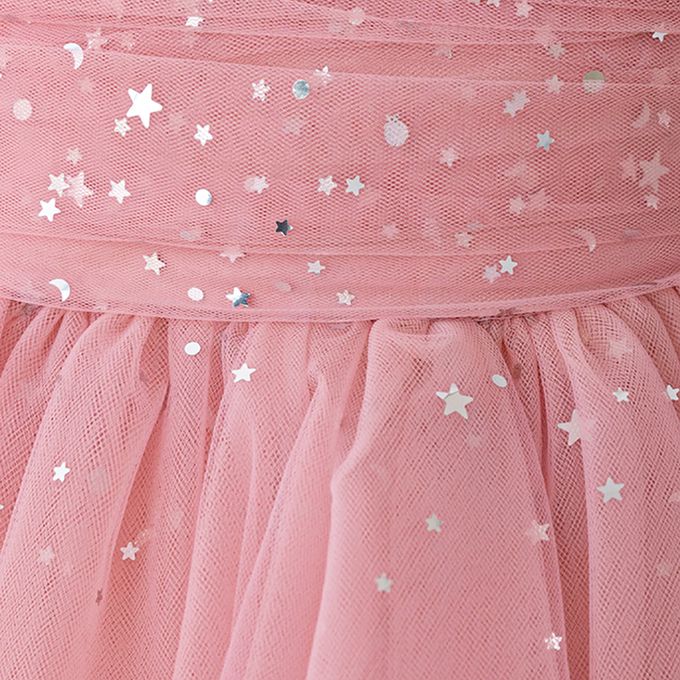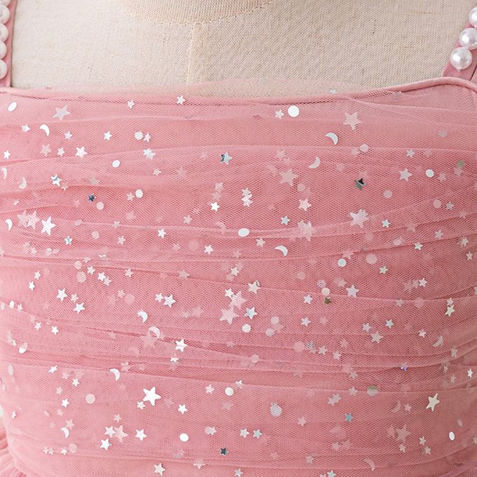 珍珠細肩帶星光亮片網紗禮服-粉色