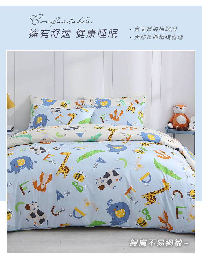 雙人薄被套床包組 防蹣抗菌100%美國棉-動物ABC-藍