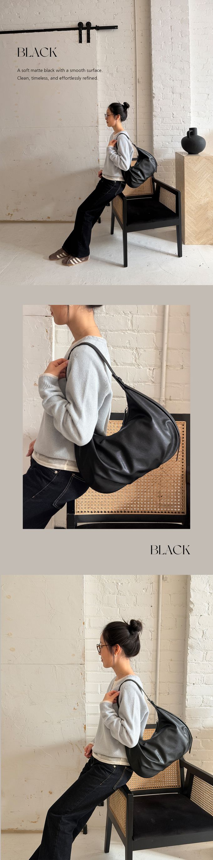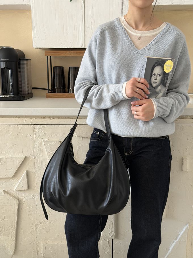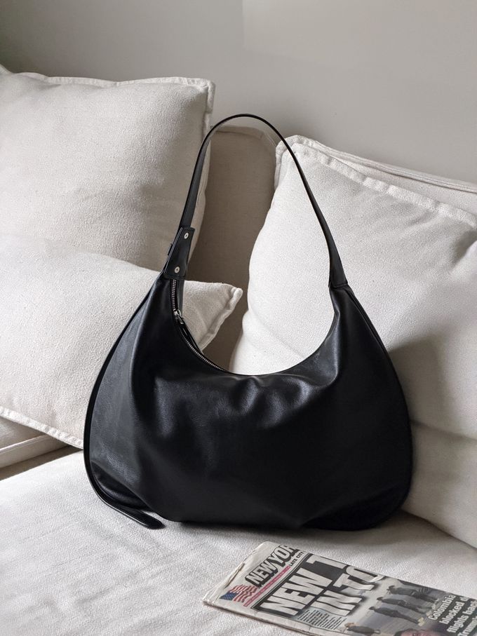 韓國 THEALLY - 小眾設計 質感輕量皮革肩背彎月包 (黑)