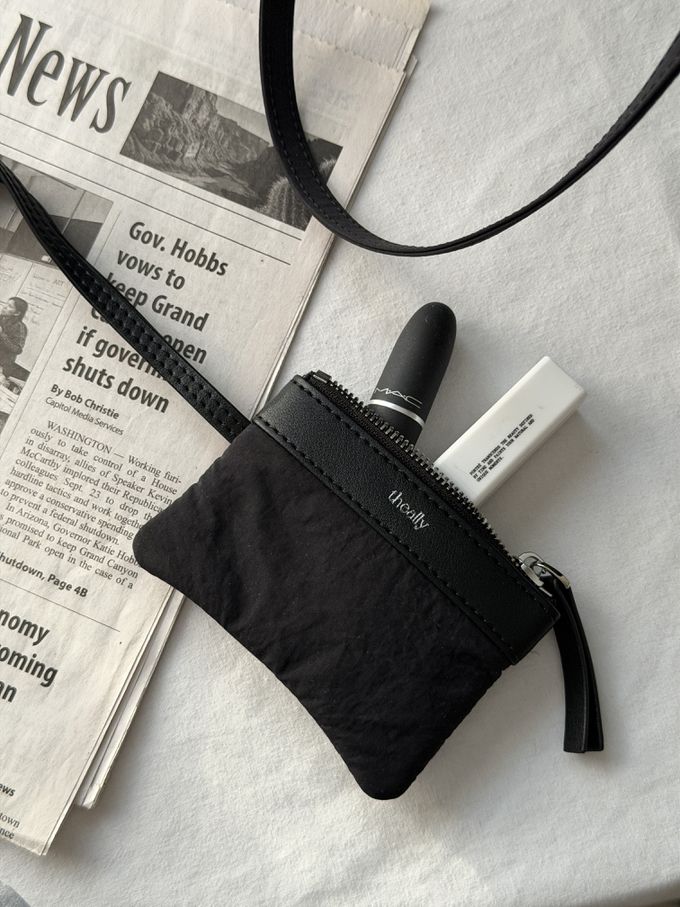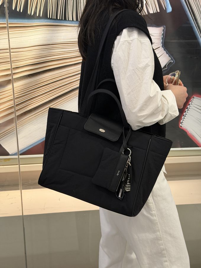 韓國 THEALLY - 小眾設計 (附小拉鍊包)輕量內分隔尼龍手提/肩背收納包 (黑)
