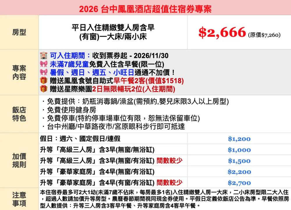 • 品名:【台中鳳凰】平日精緻雙人房一泊一食住宿券(贈星際樂園2位入住期間暢玩)
