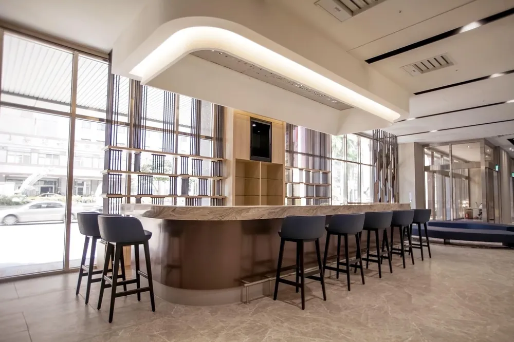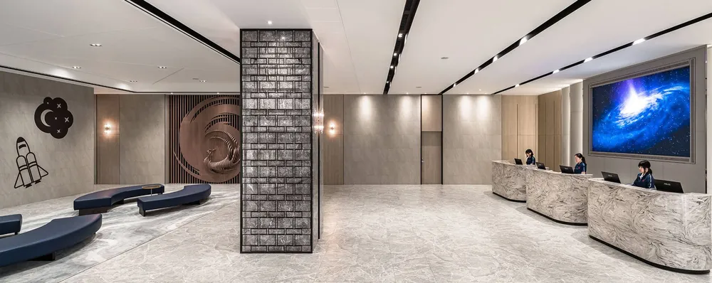 飯店的lobby名為銀河大堂,採用挑高的設計,牆面透著滿滿閃著光芒的宇宙太空元素,簡約的都會感設計,大片屏風象徵著鳳凰展翅飛翔,特殊的紋理及優雅的氣質,搭配流線型沙發座位,時尚又不失趣味。